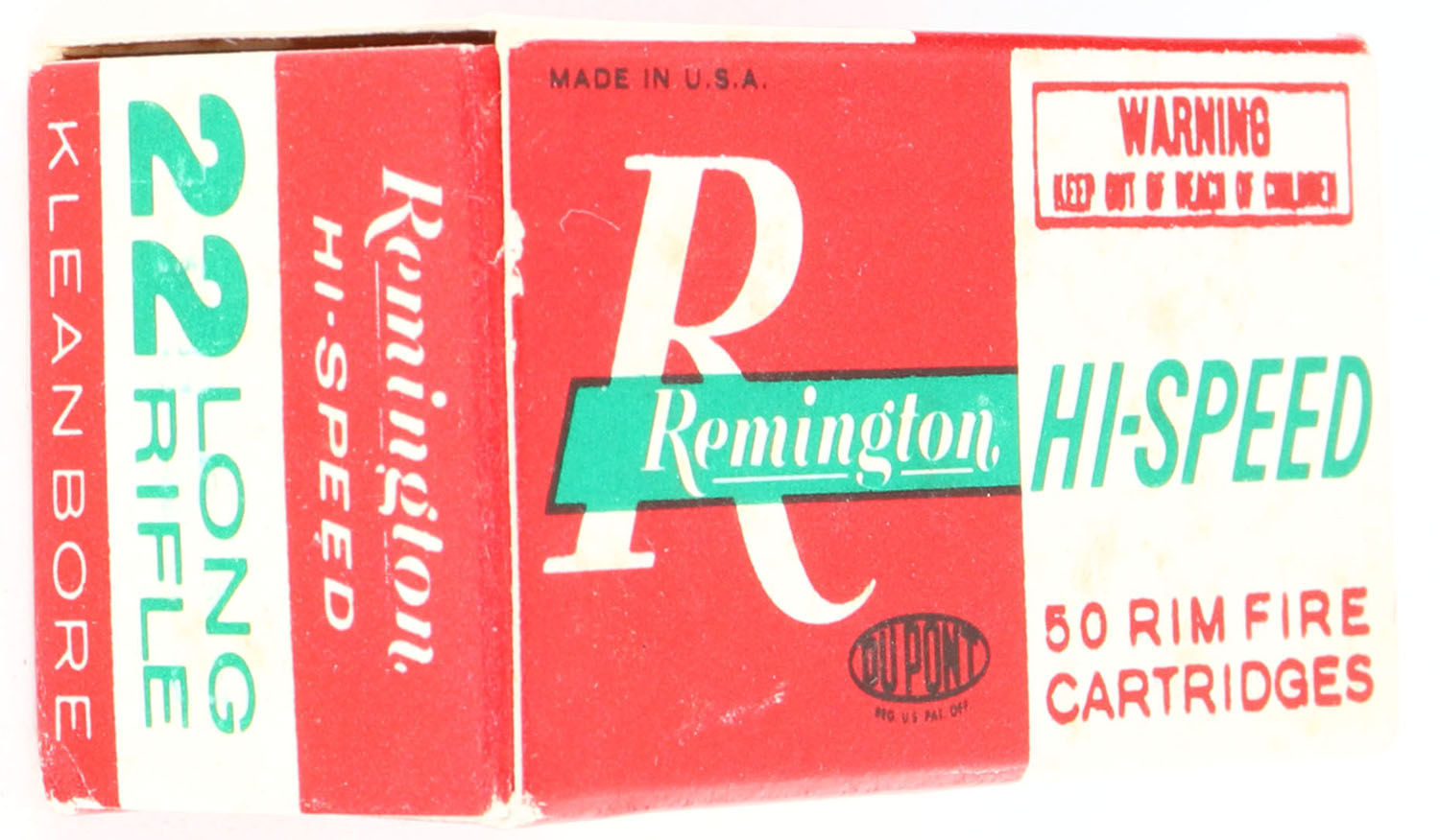 Remington, Hi-Speed, .22 Long Rifle, ''Golden'' Bullet, RHWeb: REM-17 LR-1a, Full, 1pc. Red white & green box, box is solid with excellent color, some staining, very minor corner wear, edges are crisp, ammo is excellent. Grade: Excellent - Value: 4 to 20