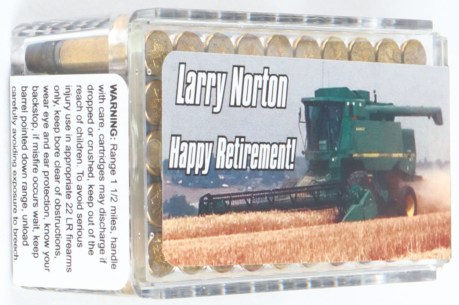CCi, Larry Norton Retirement Commemorative box, .22 Long Rifle, Standard Velocity, FULL & SEALED, 2pc. Clear plastic tray with multi-colored sealing label featuring a combine harvesting in a field, box is MINT with mint color, label is mint, ammo appears mint. Grade: MINT - Value: 50 to 150