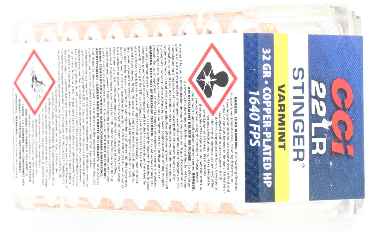 CCi, Stinger, .22 Long Rifle Stinger, FULL & SEALED, 2pc. Clear plastic tray with multi-colored sealing label, box and label are MINT with mint color, ammo appears mint. Grade: MINT - Value: 8 to 40