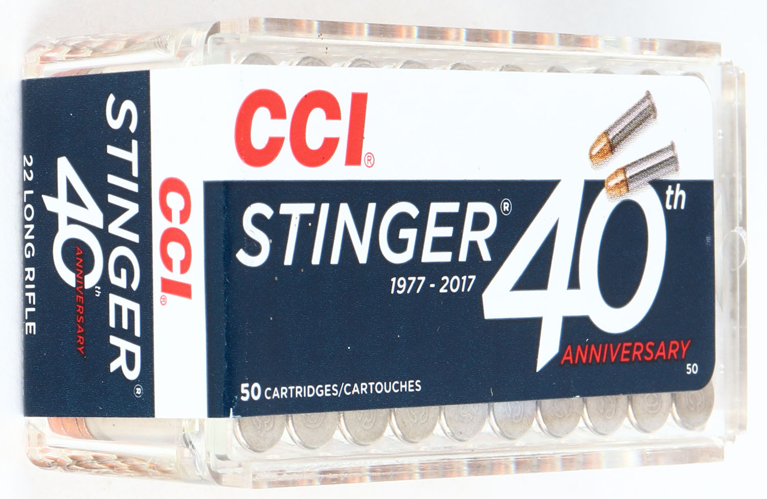 CCi, 40th Anniversary (1977-2017) Edition Stinger, .22 Long Rifle Stinger, FULL & SEALED, 2pc. Clear plastic tray with blue & white sealing label, box is MINT with mint color, label is mint, ammo appears mint. Grade: MINT - Value: 30 to 90