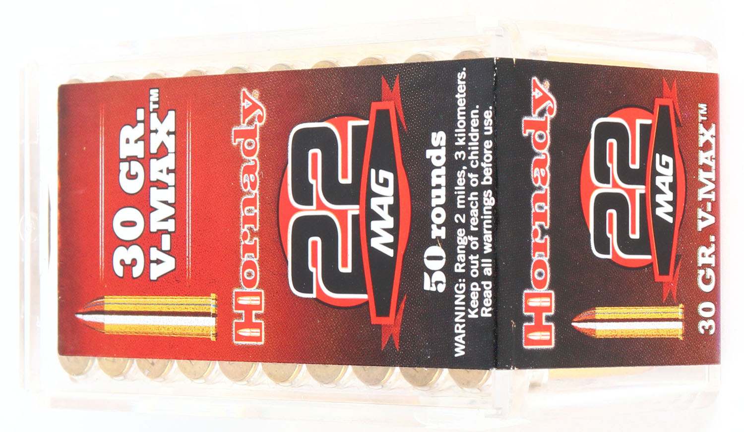 Hornady, .22 Mag, 30 Gr. V-Max, 2200 FPS, FULL & SEALED, 2pc. Clear plastic tray with red & black sealing label, box is MINT with mint color, label is mint, ammo appears mint. Grade: MINT - Value: 16 to 32