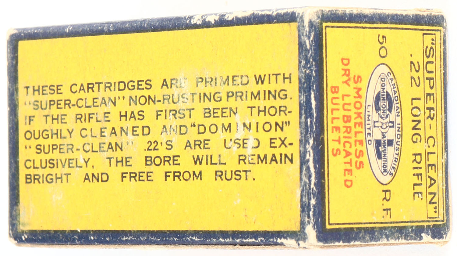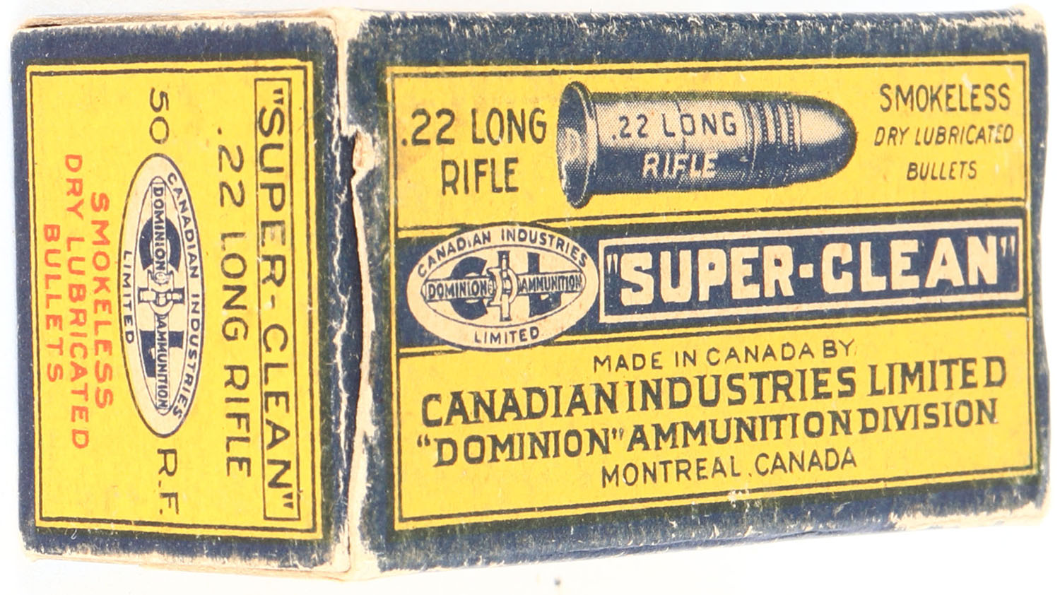 C.I.L., Super-Clean, .22 Long Rifle, Smokeless Dry Lubricated, RHWeb: CIL-2 LR-2, Full, 1pc. Yellow & blue box, box is solid with very good to excellent color, some age soiling & corner wear, minor edge wear, end flaps are solid, ammo is excellent. Grade: Very Good ++ - Value: 8 to 40