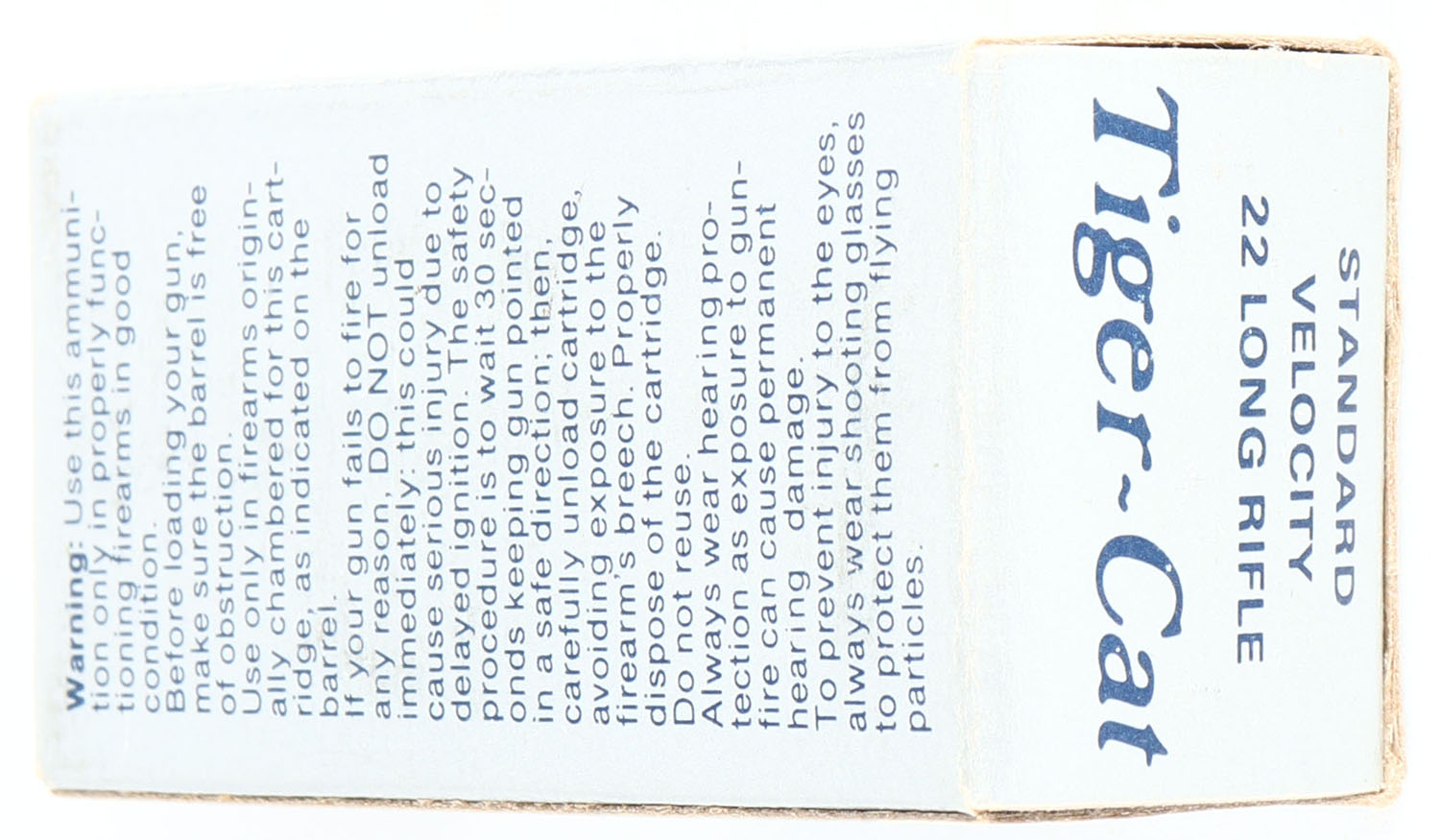 Sovereign, Tiger-Cat, .22 Long Rifle, Standard Velocity, RHWeb: SGD-1 LR-3, Full, 1pc. Silver & blue box, box is solid with minty color, very minor corner wear, edges are crisp, end flaps are solid, ammo is excellent. Grade: Excellent ++ - Value: 10 to 40