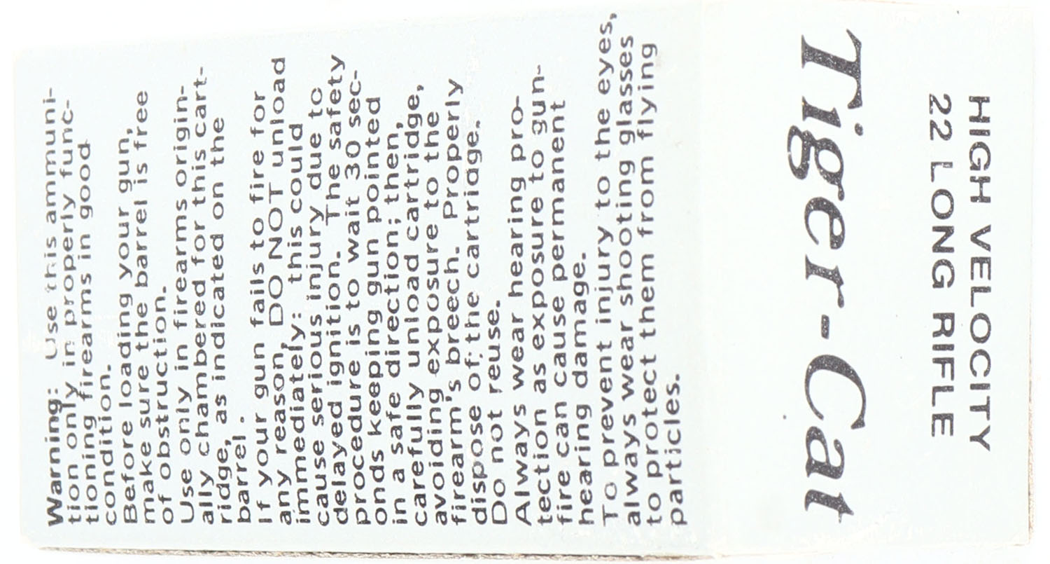 Sovereign, Tiger-Cat, .22 Long Rifle, High Velocity, RHWeb: SGD-1 LR-1a, Full, 1pc. Silver & black box, box is near mint with minty color, only very minor shelf wear, corners are sharp, edges are crisp, end flaps are solid, ammo is excellent. Grade: Excellent ++ - Value: 10 to 40