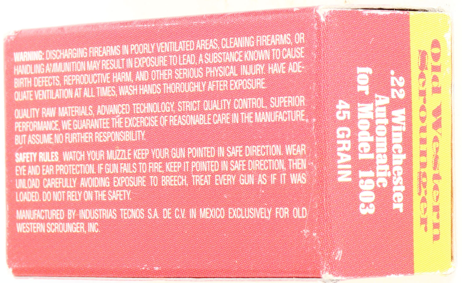 Old Western Scrounger, .22 Winchester Automatic, RHWeb: IT-10 WA-1, Full, 1pc. Yellow & red box, box is near mint with mint color, only very minor edge wear, corners are mostly sharp, end flaps are solid, ammo is excellent. Grade: Excellent ++ - Value: 20 to 40