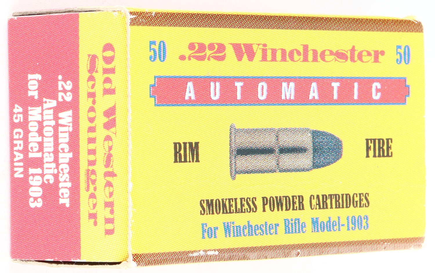 Old Western Scrounger, .22 Winchester Automatic, RHWeb: IT-10 WA-1, Full, 1pc. Yellow & red box, box is solid with minty color, has a crease across the top, very minor edge wear, corners are mostly sharp, end flaps are solid, ammo is mint. Grade: Excellent + - Value: 20 to 40