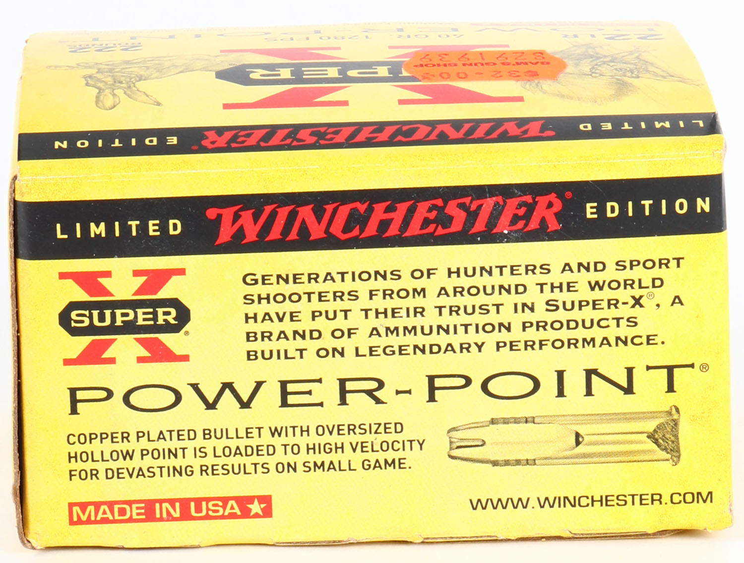 Winchester, Super X Power-Point, .22 Long Rifle, Full, 222rds. 1pc. Yellow black & red bulk box, box is MINT with minty color, corners are sharp, edges are crisp, top flap is solid, ammo is mint. Grade: MINT - Value: 10 to 50