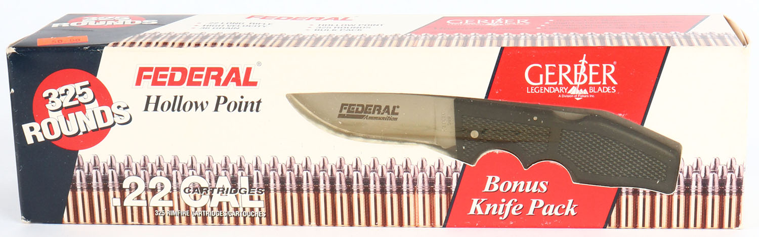 Federal, Gerber Knife Promotional Box, .22 Long Rifle Hollow Point, 36 Grain, FULL & SEALED, 325rds., 1pc. Multi-colored brick that displays Gerber Magnum Junior folding knife, brick is solid with excellent to minty color, very minor shelf & corner wear, edges are mostly crisp, knife appears mint. Grade: Excellent ++ - Value: 40 to 120