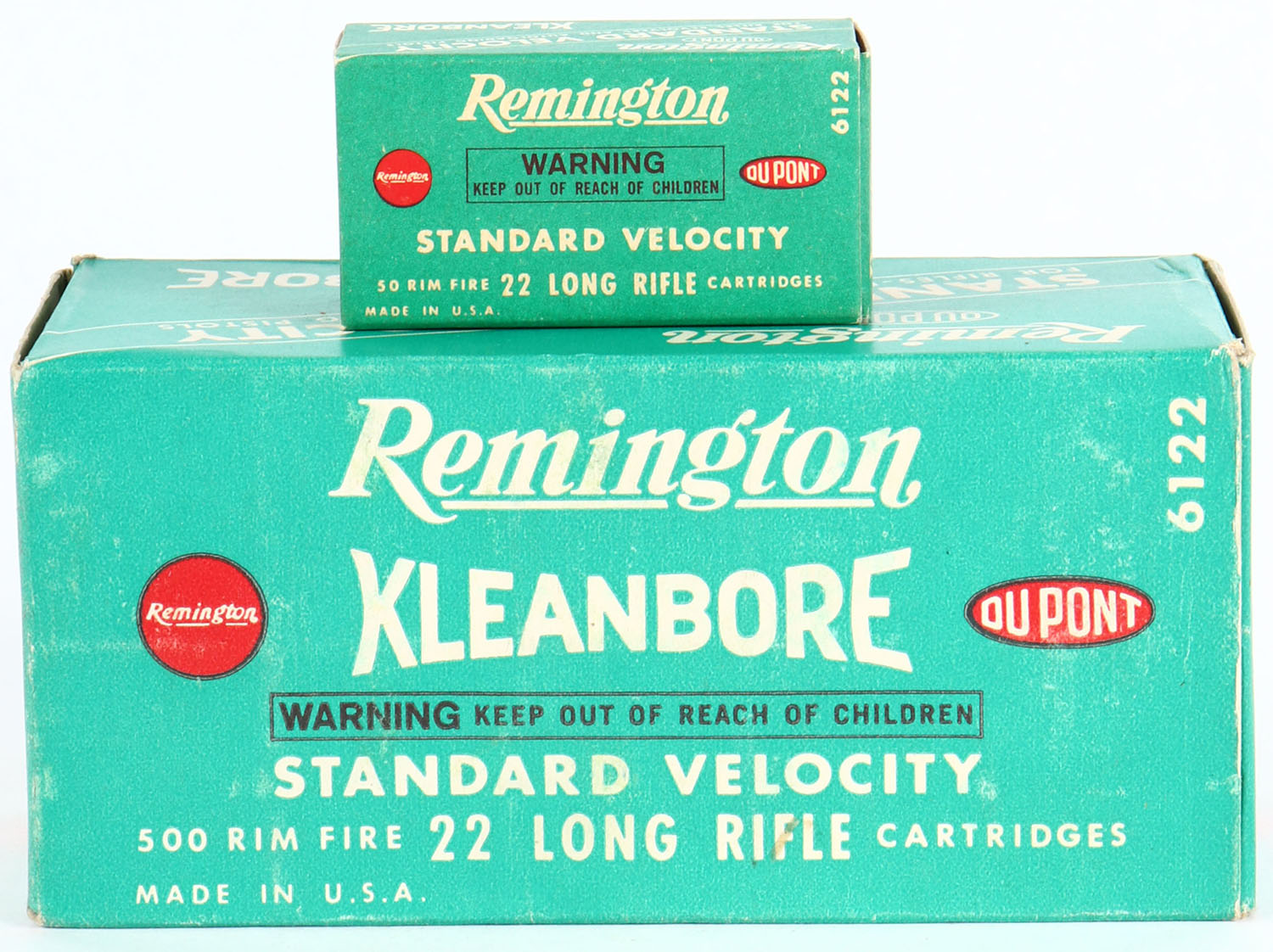 Remington, Kleanbore, .22 Long Rifle, Standard Velocity, Full 10 boxes (2 boxes are partial), 1pc. Green white & red brick, brick is solid with excellent color, minor shelf & corner wear, very minor edge wear, end flaps are solid, inside boxes are minty. Grade: Excellent + - Value: 30 to 90