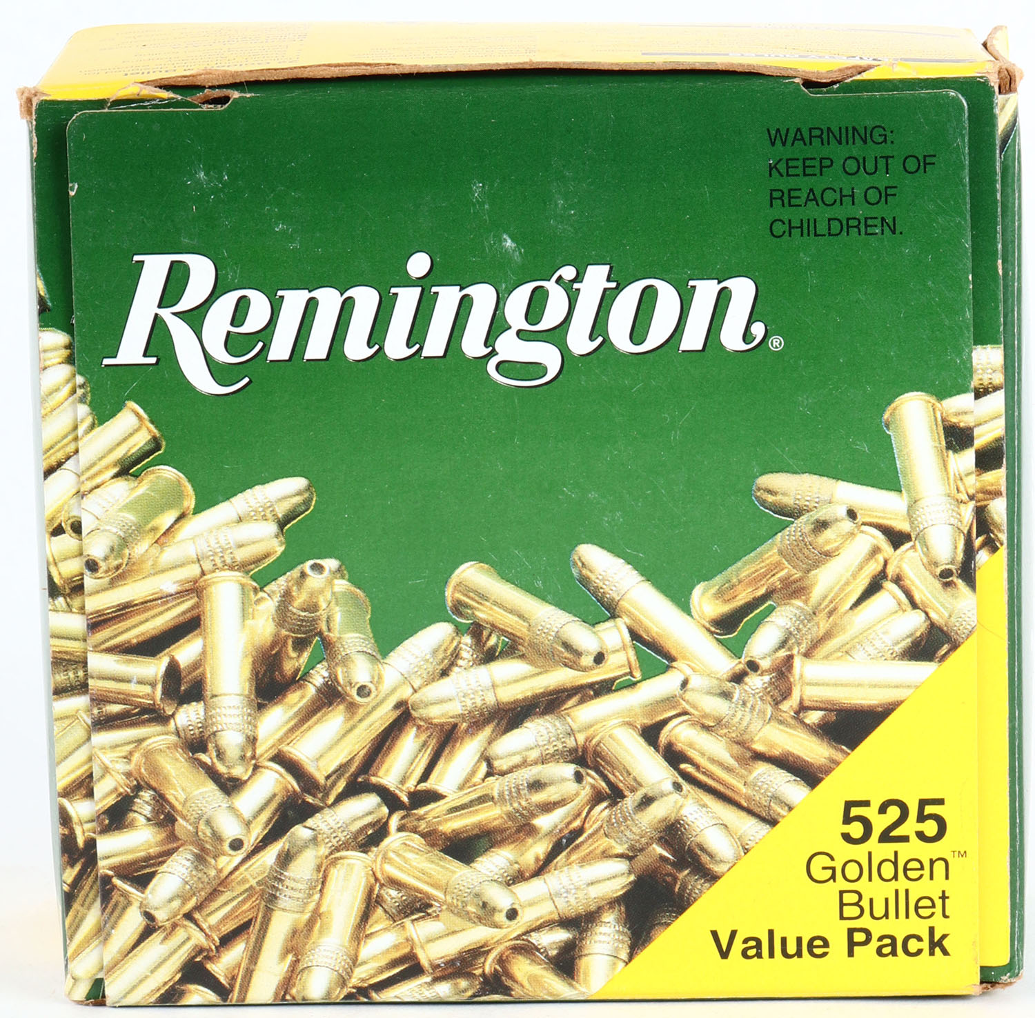 Remington, Golden Bullet Value Pack, .22 Long Rifle Hollow Point, Brass Plated, Full 525rds. 1pc. Green & yellow bulk box, box is solid with minty color, very minor corner wear, edges are crisp, top flap is solid, ammo is minty. Grade: Excellent ++ - Value: 20 to 60
