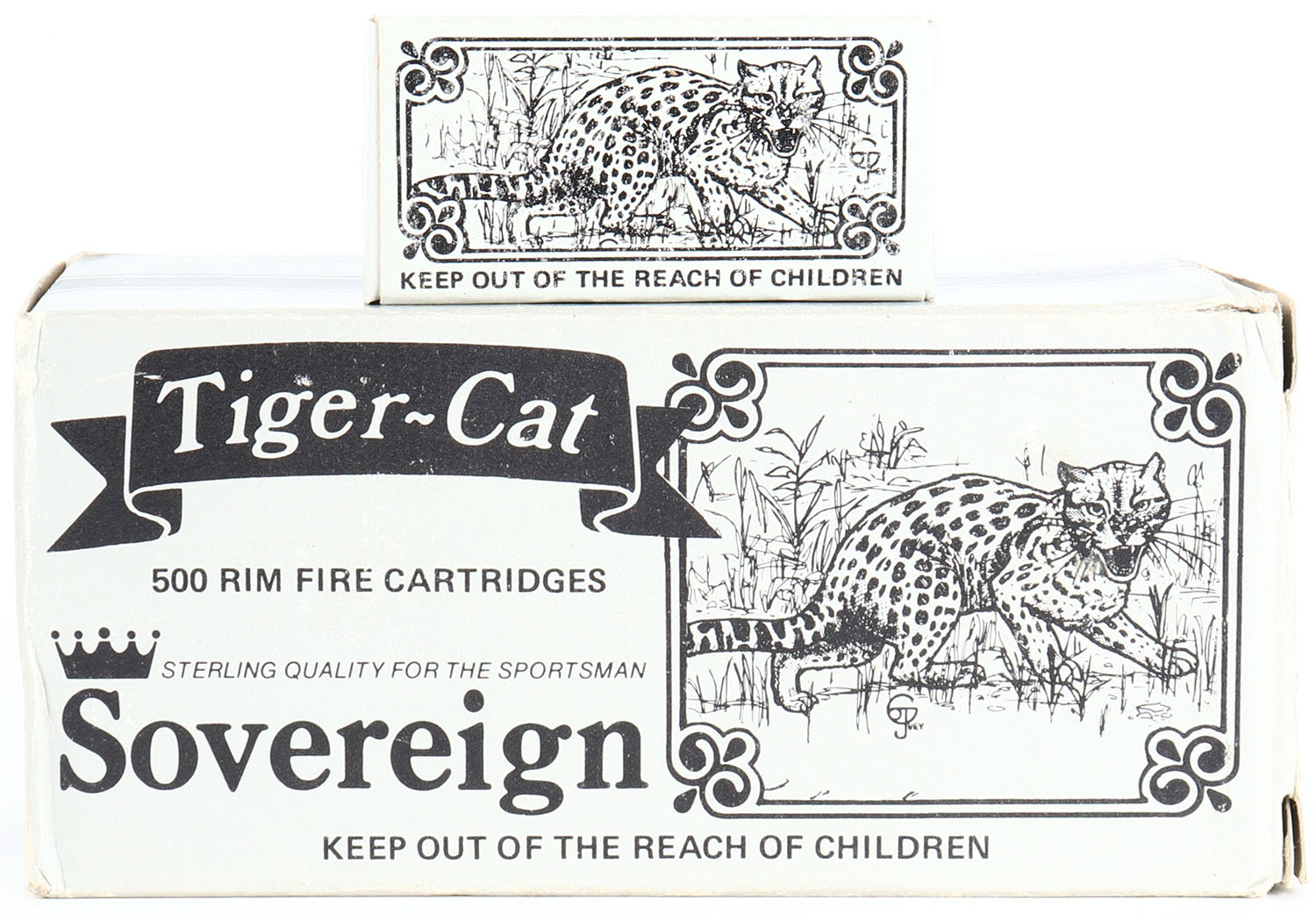 Sovereign, Tiger-Cat, .22 Long Rifle, High Velocity, Full, 500rds. 1pc. Gray & black brick, brick is solid with excellent color, shelf wear, minor corner wear, edges are mostly crisp, , end flaps are solid, inside boxes are mint. Grade: Excellent - Value: 100 to 200