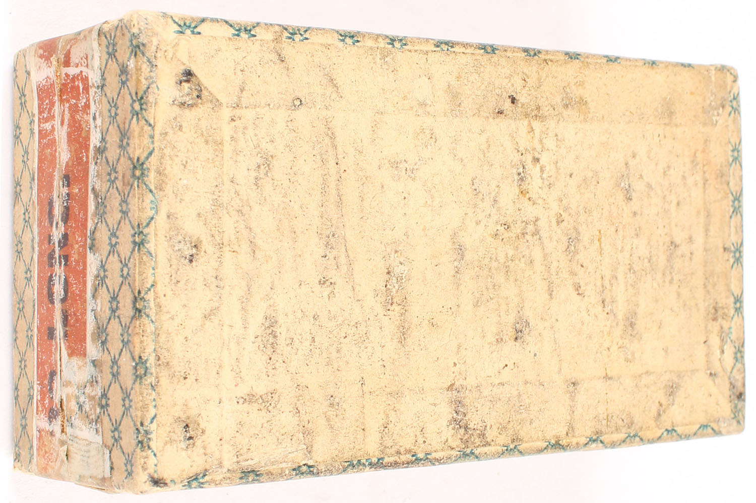 American Metallic, Special Target Cartridges, .38-100 Long, Double Waterproof, Full, 2pc. Blue & white patterned box with gray top & orange side sealing labels, box is solid with very good color, some age soiling, minor shelf wear, tape covering side sealing band which is 95% intact, very minor edge & corner wear, top label intact, ammo is very good. Grade: Very Good + - Value: 100 to 300