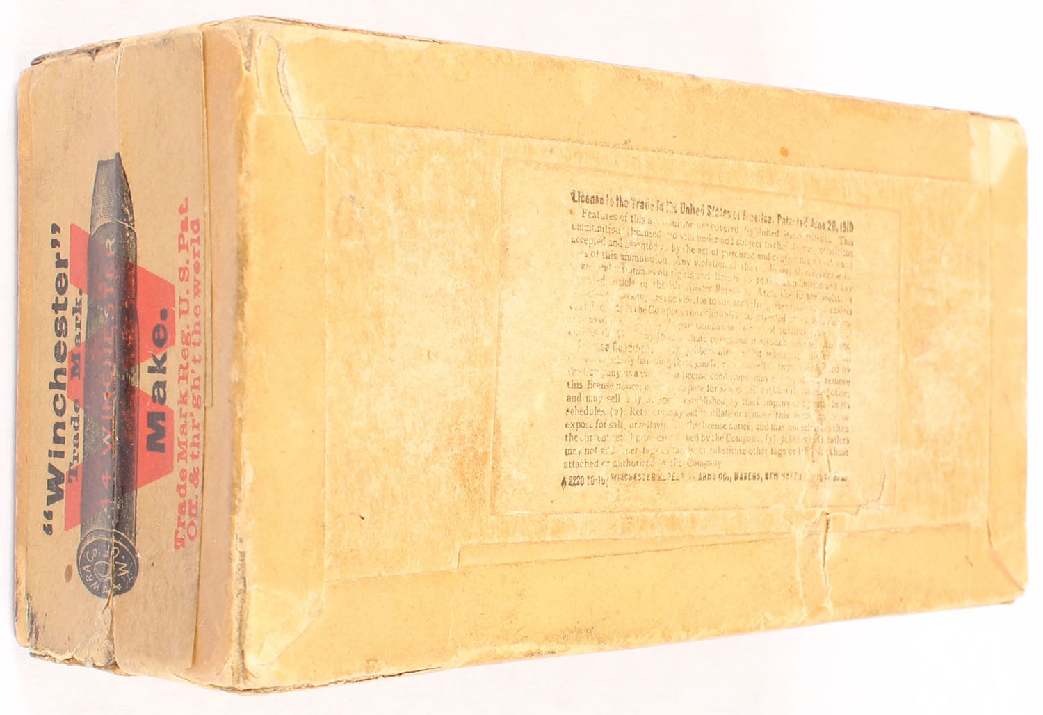 Winchester, .44 Winchester Center Fire, Solid Head, Partial 18rds. Correct, 2pc. Buff box with green top & buff side sealing label, box is solid with very good to excellent color, some age soiling, minor shelf wear, corner wear, some edge wear, labels are intact, left end has been written on, ammo is excellent. Grade: Very Good ++ - Value: 20 to 80