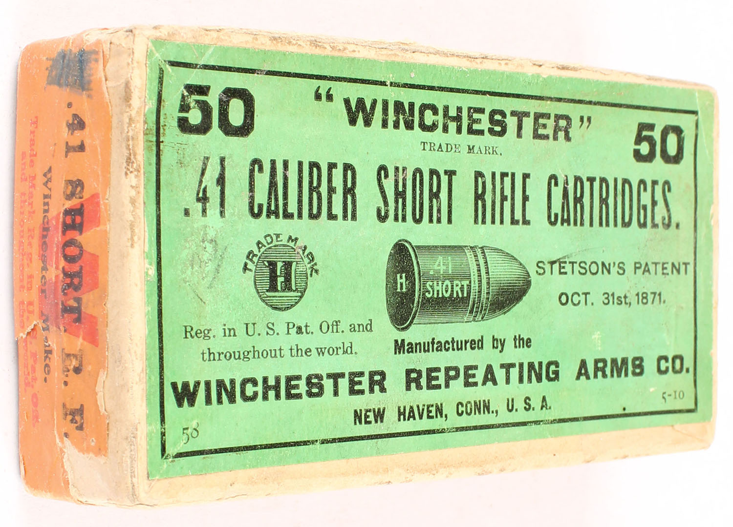 Winchester, .41 Caliber Short Rim Fire, Full & Partially Sealed, 2pc. Buff box with green top & orange side sealing labels, with insert, box is solid with excellent color, very minor age soiling, some edge & corner wear, vertical seam split on front left corner, both ends & top have been written on, labels are intact, insert is excellent, ammo is fair. Grade: Excellent - Value: 200 to 400