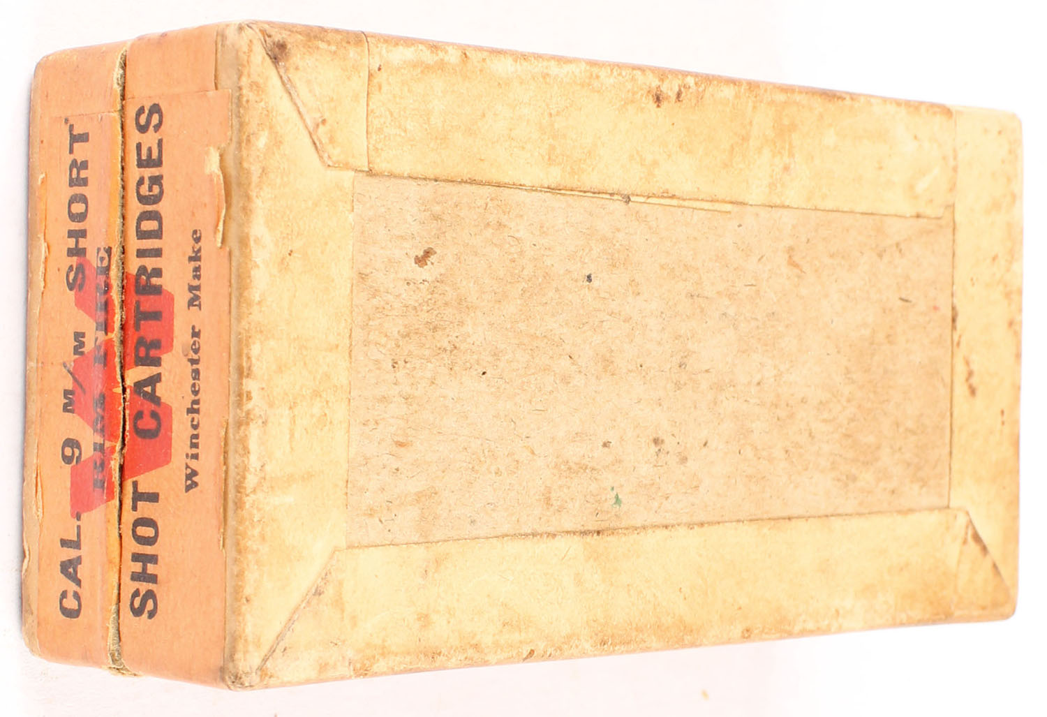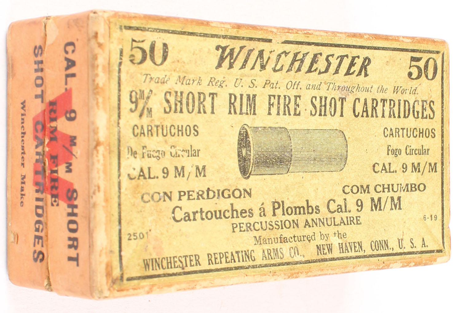 EXTEMELY RARE! Winchester, 9mm Short Shot, Rim Fire, Partial 6rds., This is the first example of an uncataloged box that I have seen, 2pc. Buff box with green top & orange side sealing labels, box is solid with very good color, some age soiling & color fading, minor shelf wear, minor edge & corner wear, labels are intact, ammo is excellent. Grade: Very Good ++ - Value: 600 to 1800