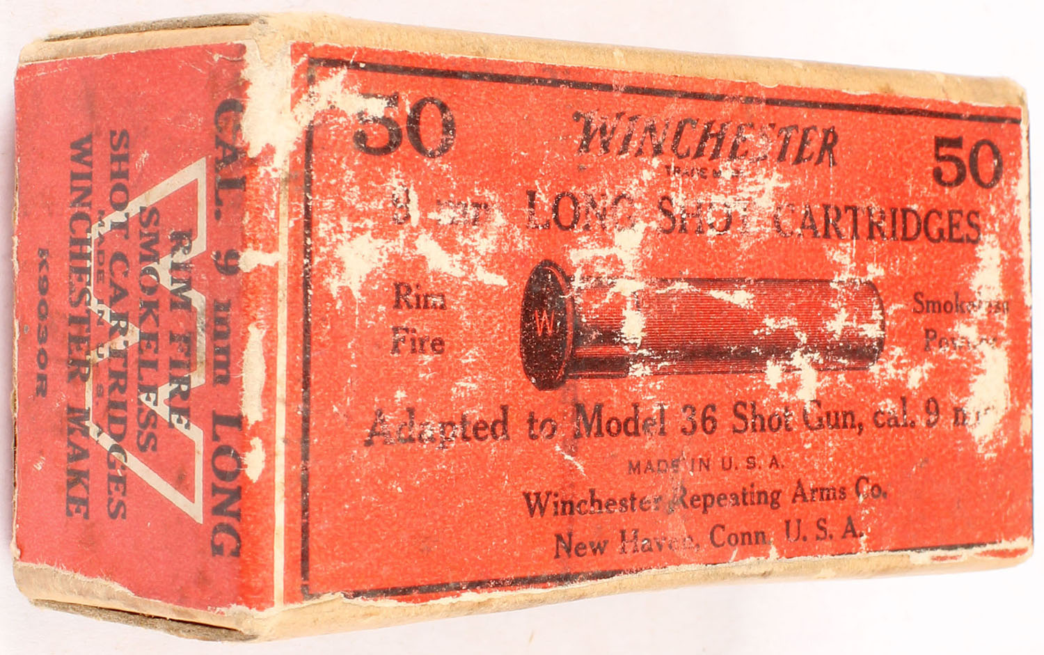 Winchester, 9mm Long Shot Cartridges, Rim Fire, FULL & SEALED, 2pc. Buff box with red wraparound label, box is solid with very good color, some age soiling shelf wear, minor corner & edge wear, label is intact, ammo is excellent. Grade: Very Good ++ - Value: 100 to 400