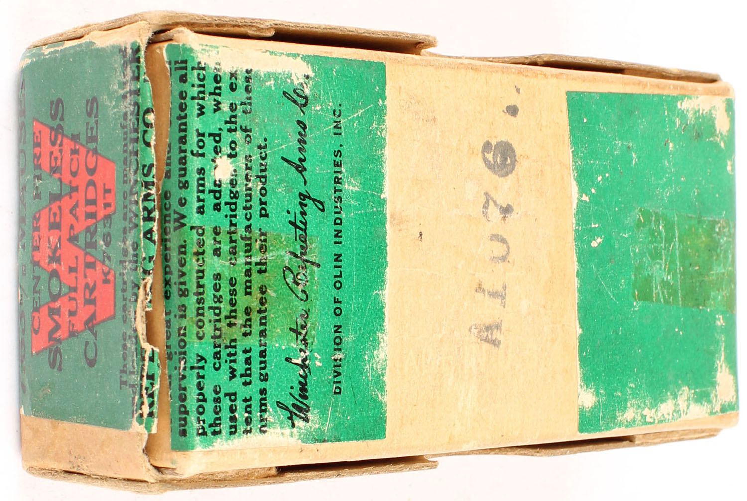 Winchester, Staynless, 7.63mm / .30 Cal. Mauser, 86 Grain Full Patch Bullets, Full of incorrect ammo, 2pc. Buff box with orange & green wraparound label, box is solid with very good to excellent color, some age soiling & shelf wear, some corner wear, edges are mostly crisp, label is intact, ammo is excellent. Grade: Excellent - Value: 20 to 60