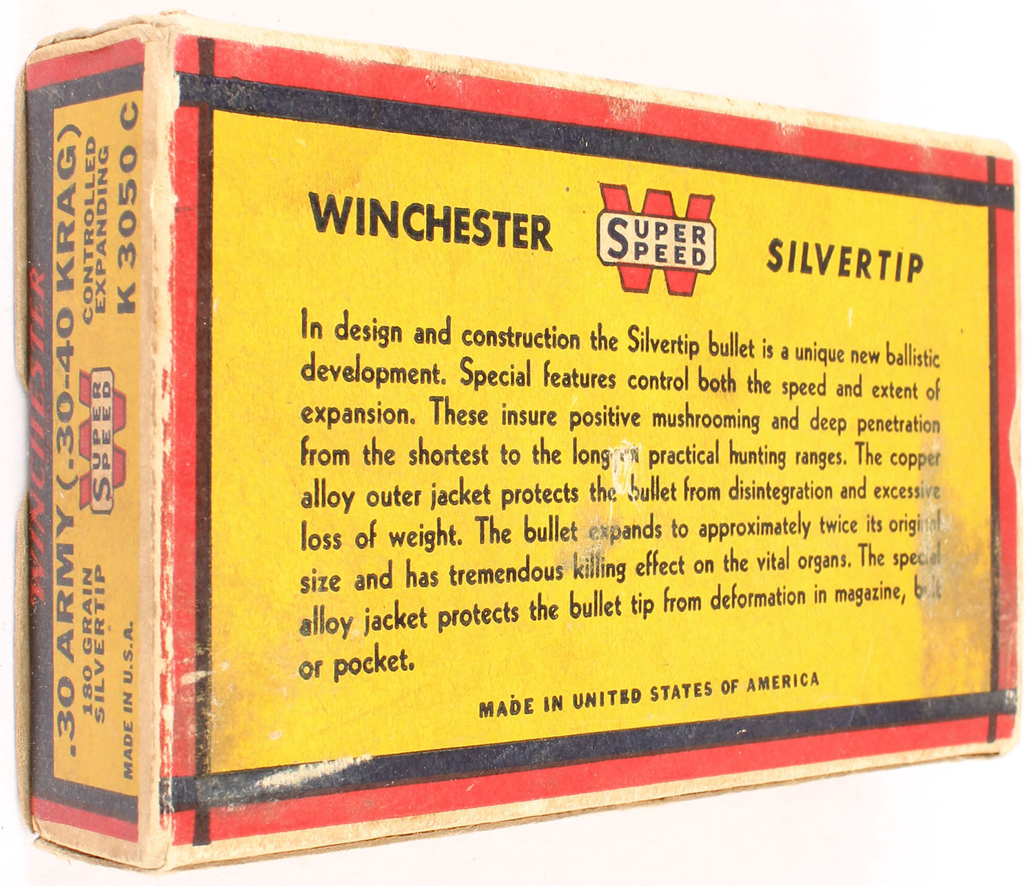Winchester, Silvertip, .30 Army (.30-40 Krag), 180 Grain Controlled Expanding Bullet, Partial 19rds. Correct, 1pc. Yellow blue & red bear box, box is solid with very good to excellent color, some age soiling, some edge & corner wear, end flaps are solid, ammo is excellent. Grade: Very Good ++ - Value: 30 to 90