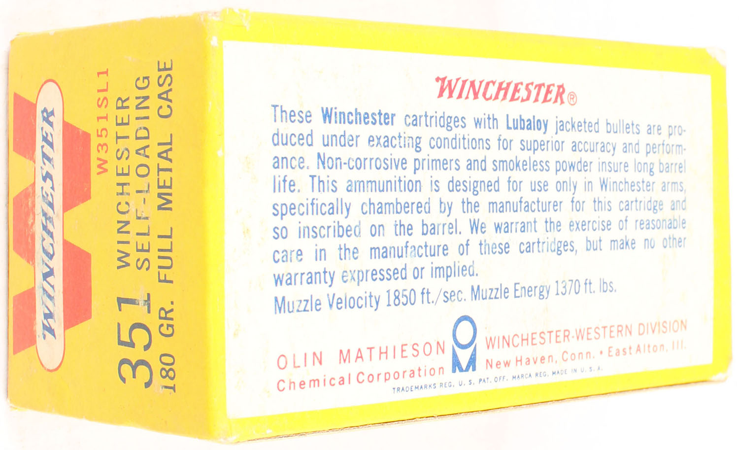 Winchester, .351 Winchester Self-Loading, 180 Grain Full Metal Case, Full, 1pc. Yellow white & red box, box is solid with very good to excellent color, very minor age soiling, some shelf wear, some corner wear, very minor edge wear, end flaps are solid, ammo is excellent. Grade: Excellent - Value: 100 to 250