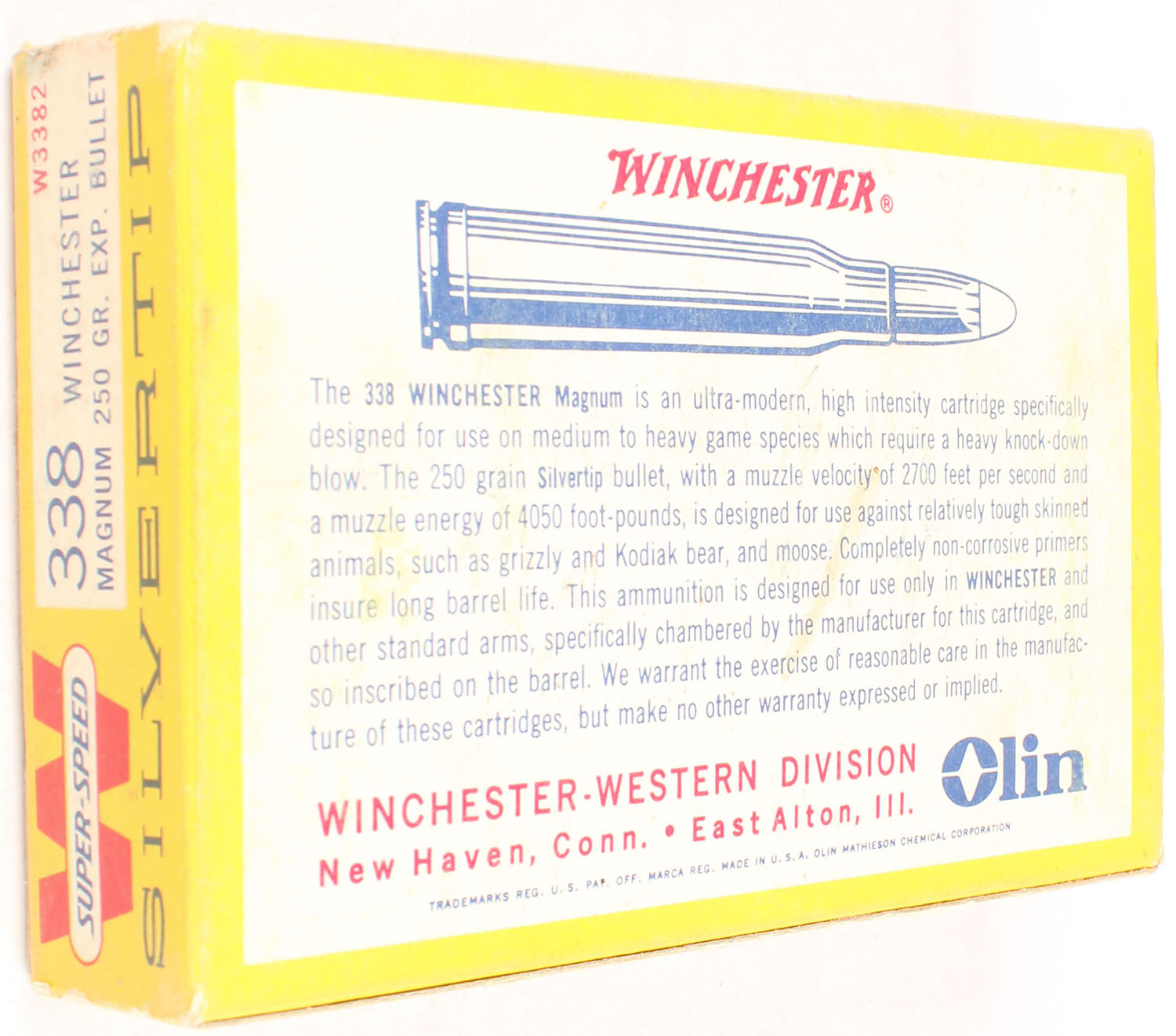 Winchester, Silvertip, .338 Winchester Magnum, 250 Grain Expanding Bullet, Full, 1pc. Yellow white & red box, box is solid with excellent color, some shelf wear, very minor corner wear, edges are crisp, end flaps are solid, ammo is excellent. Grade: Excellent - Value: 30 to 90
