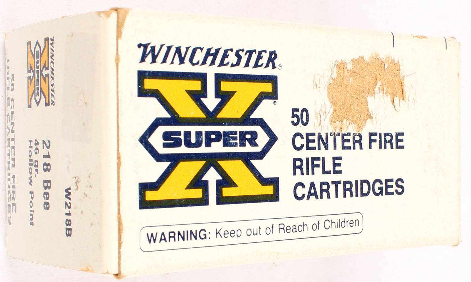 Winchester, Super X, .218 Bee, 46 Grain Hollow Point, Partial 47rds., 1pc. White orange & black box, box is solid with excellent color, scuff on top, very minor corner wear, edges are crisp, end flaps are solid, ammo is excellent. Grade: Very Good ++ - Value: 20 to 80