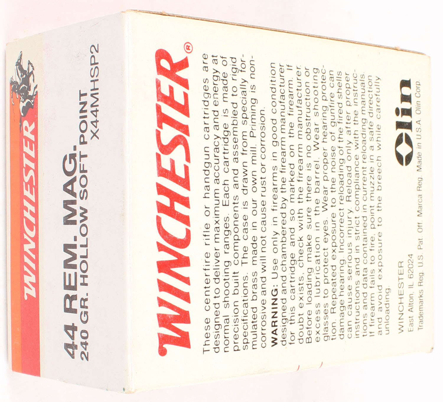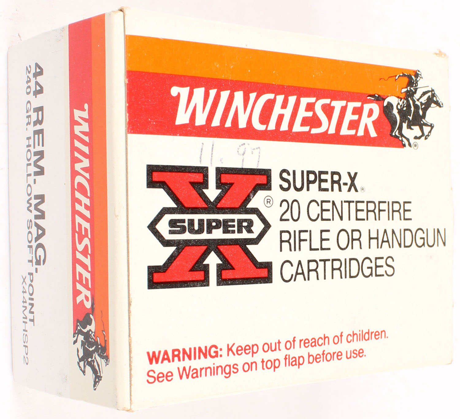 Winchester, Super-X, .44 Rem. Mag., 240 Grain Hollow Soft Point, Full, 1pc. White red & orange box, box is near mint with minty color, only has writing on top, corners are sharp, edges are crisp, end flaps are solid, ammo is minty. Grade: Excellent ++ - Value: 20 to 60