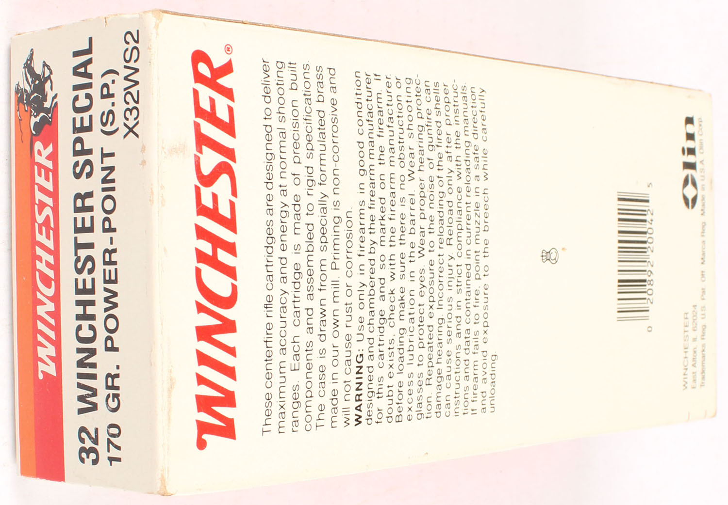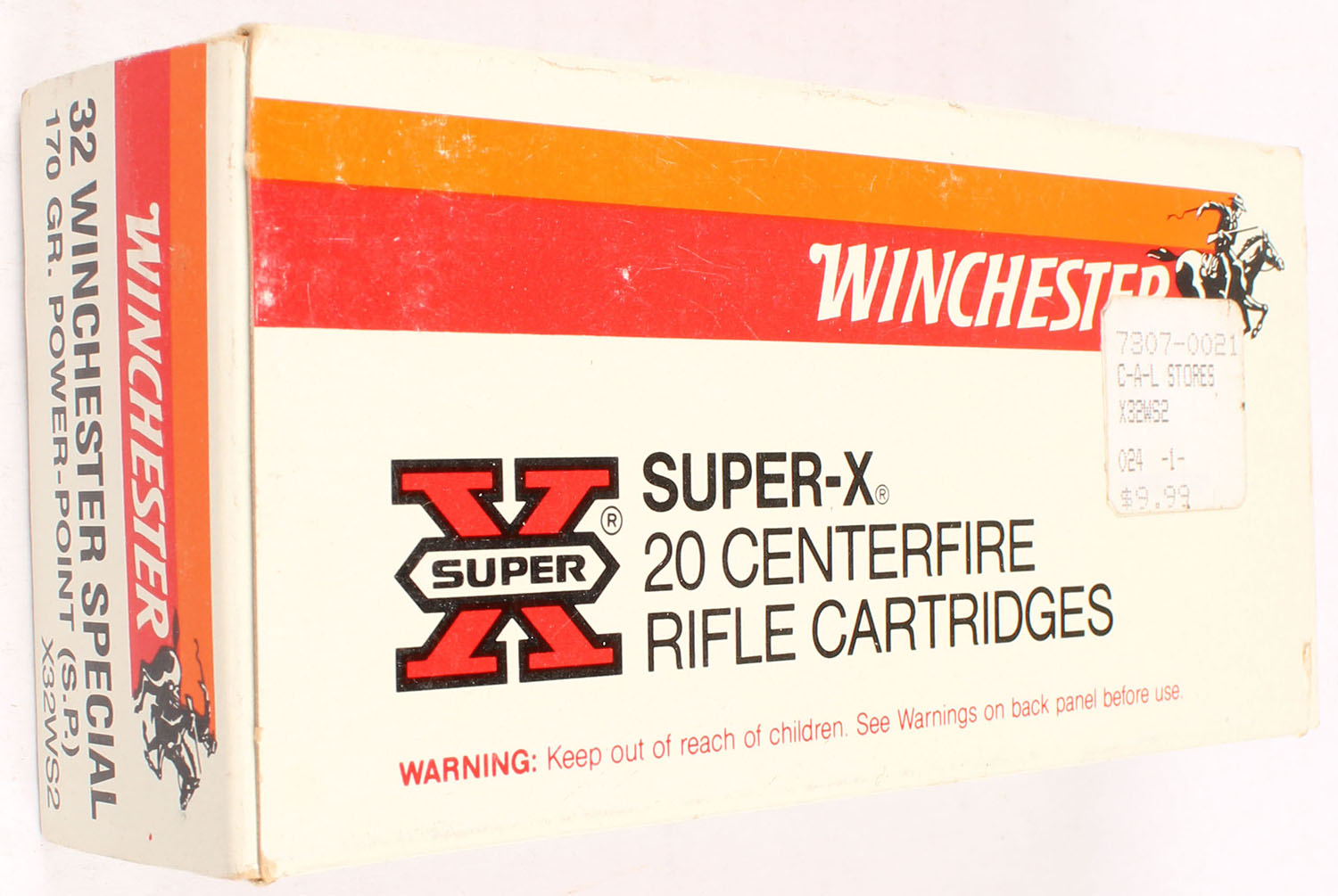 Winchester, Super-X, .32 Winchester Special, 170 Grain Silvertip, Full, 1pc. White red & orange box, box is near mint with minty color, only has very minor corner wear, sticker on top, edges are crisp, end flaps are solid, ammo is excellent to minty. Grade: Excellent ++ - Value: 20 to 60