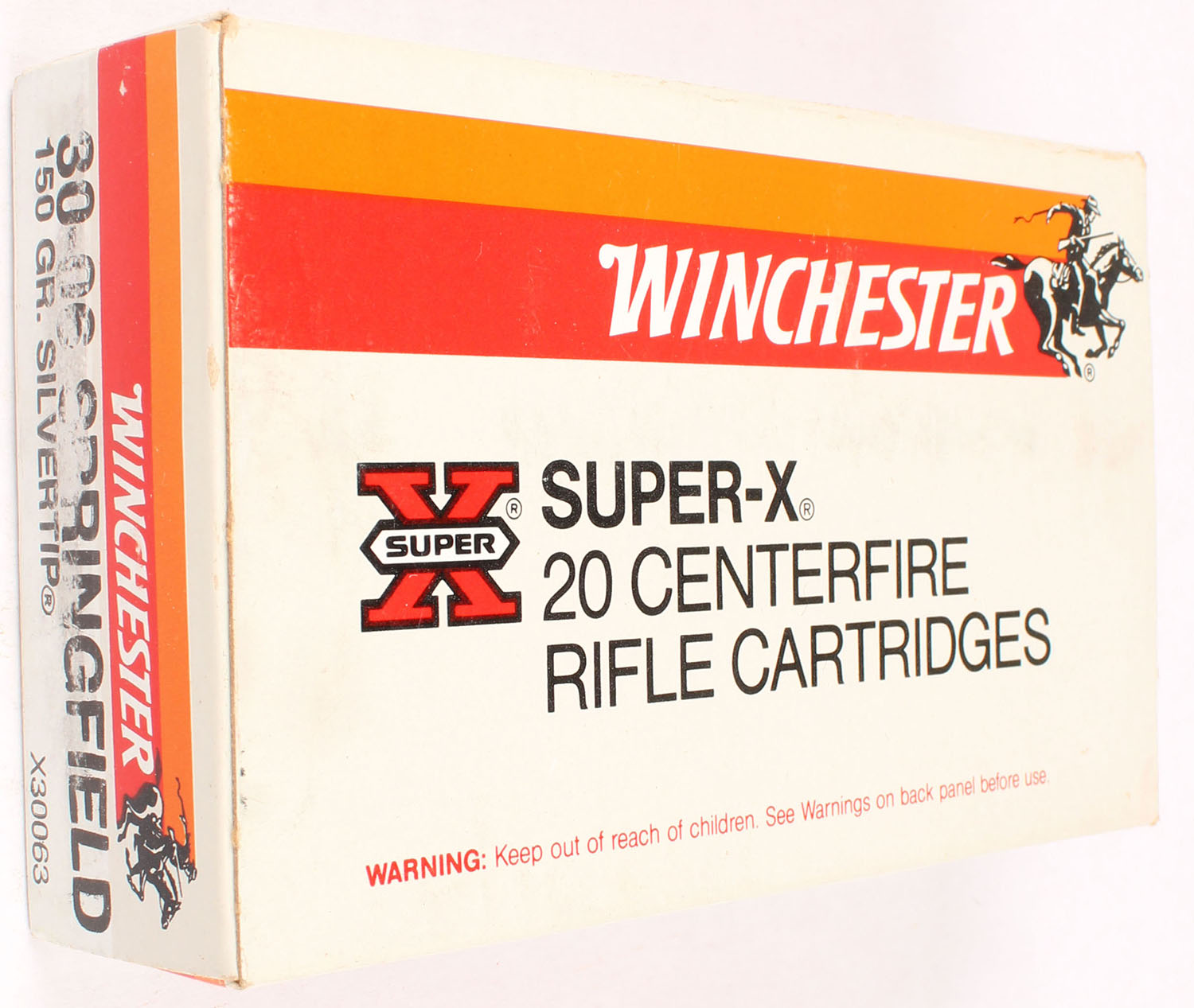 Winchester, Super X, .30-06 Springfield, 110 Grain Silvertip, Partial 12rds. Correct, 1pc. Gray red & orange box, box is solid with excellent color, minor shelf wear, very minor corner wear, edges are crisp, end flaps are solid, ammo is excellent. Grade: Excellent - Value: 10 to 50