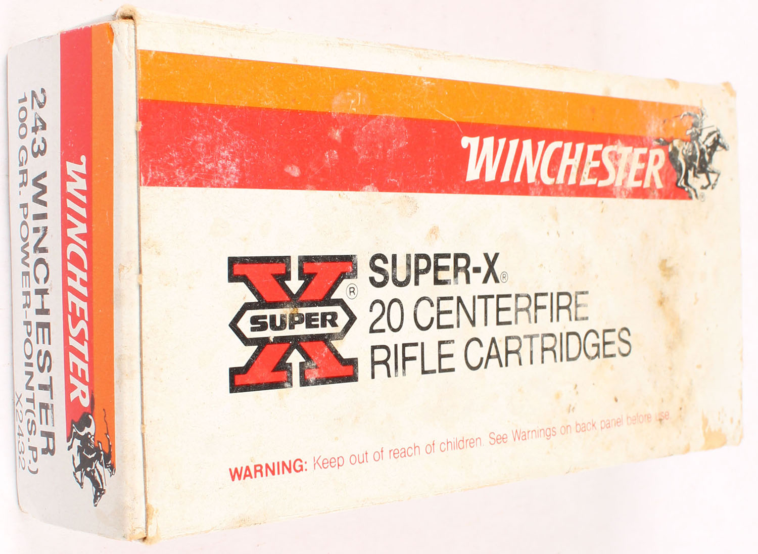 Winchester, Super X, .243 Winchester, 100 Grain Power-Point, Full, 1pc. White red & orange box, box is solid with good to very good color, staining on top, some shelf & corner wear, minor edge wear, end flaps are solid, ammo is excellent. Grade: Very Good + - Value: 20 to 60