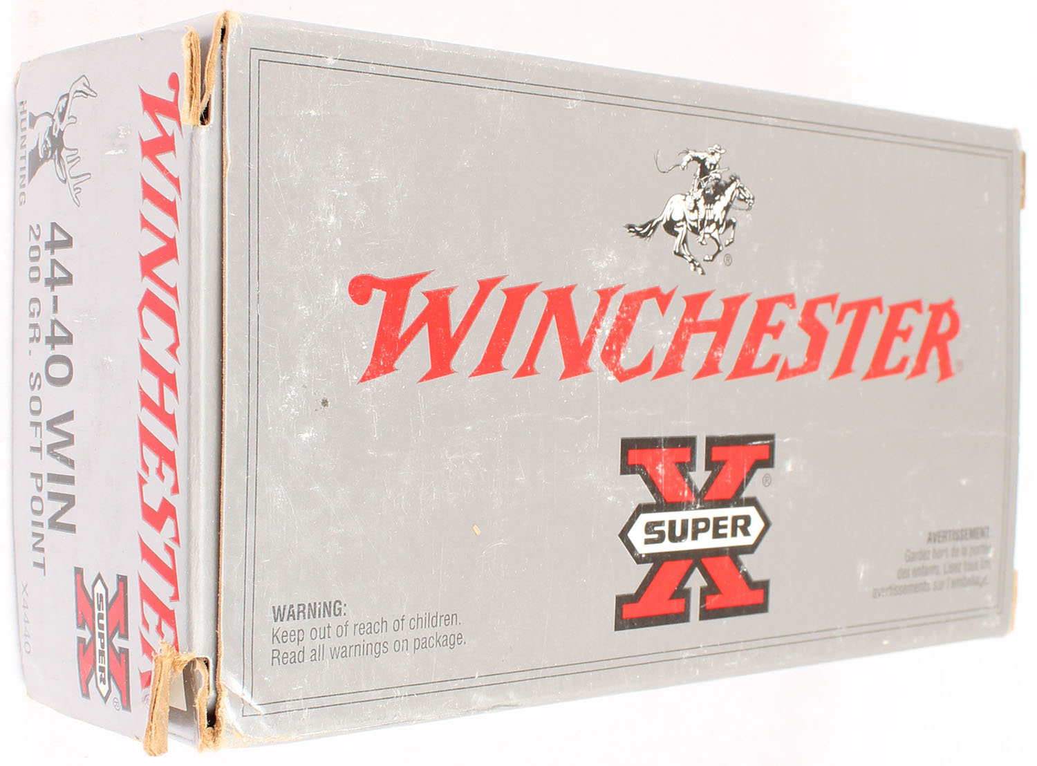 Winchester, Super-X, .44-40 Winchester, 200 Grain Soft Point, Full, 1pc. Silver & red box, box is solid with excellent color, minor shelf & corner wear, very minor edge wear, end flaps are solid, ammo is excellent. Grade: Excellent - Value: 50 to 150