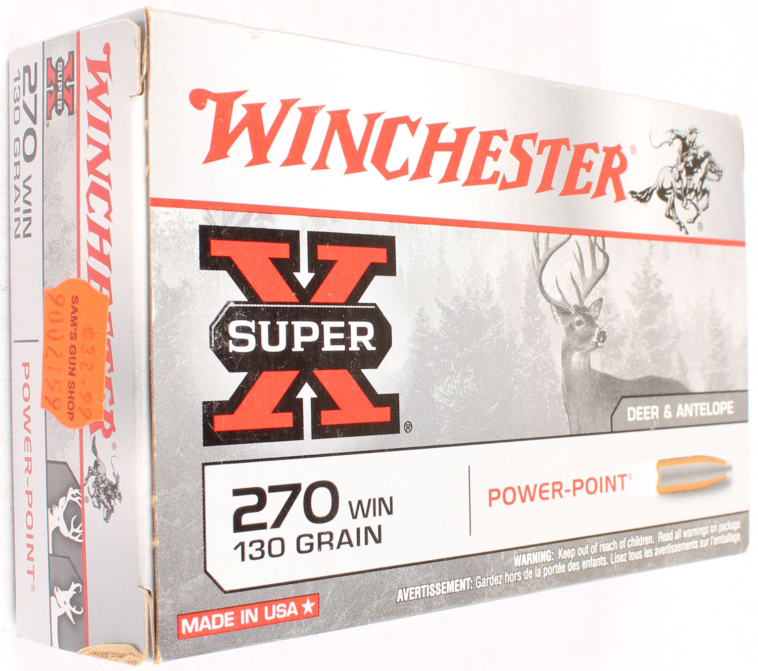 Winchester, Super X, .270 Winchester, 130 Grain Power-Point, Full, 1pc. Gray & red box, box is solid with minty color, very minor corner wear, edges are crisp, end flaps are solid, ammo is minty. Grade: Excellent ++ - Value: 20 to 60