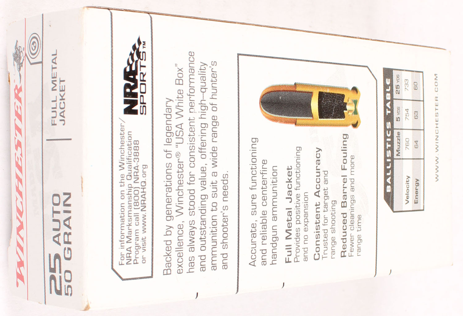 Winchester, Target, .25 Auto., 50 Grain Full Metal Jacket, Full, 1pc. White & red box, box is solid with excellent to minty color, very minor corner wear, edges are crisp, end flaps are solid, ammo is minty. Grade: Excellent ++ - Value: 10 to 40