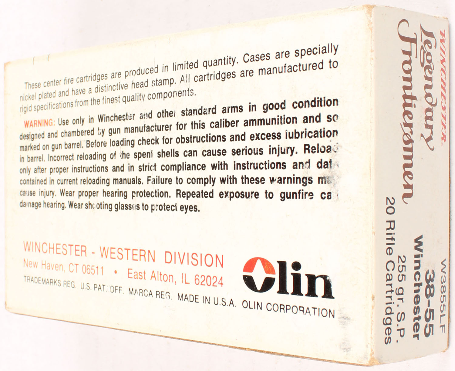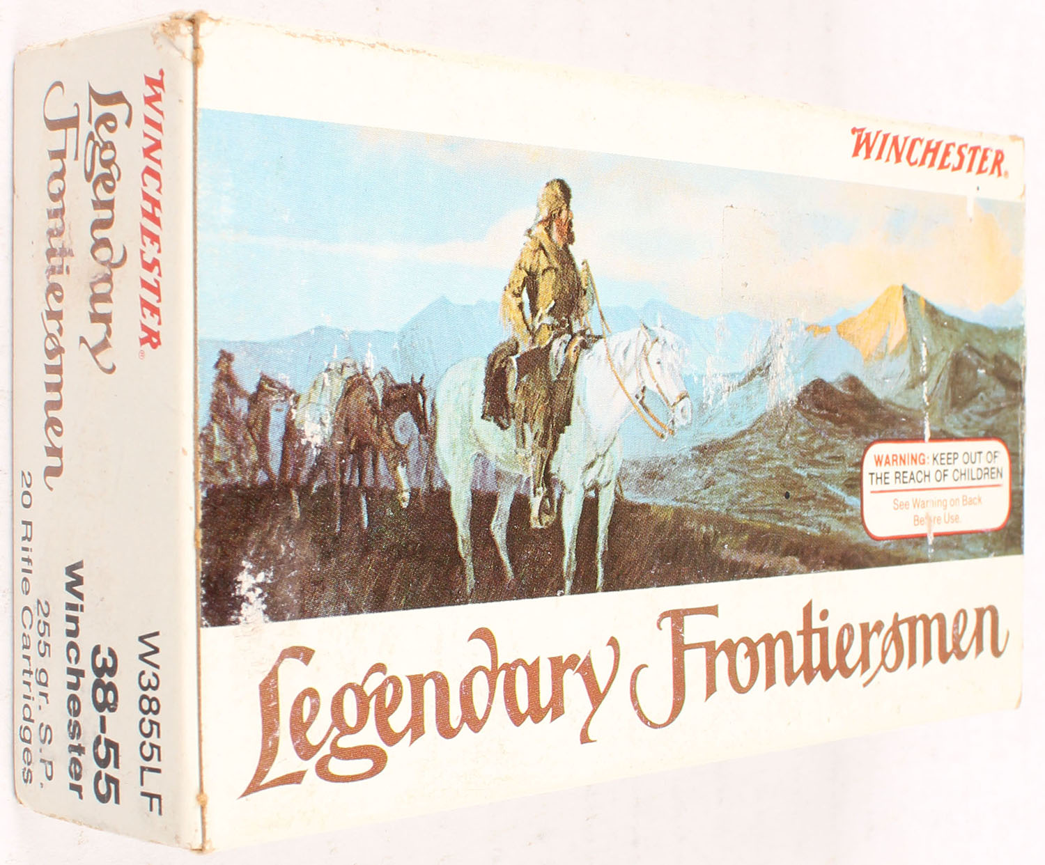 Winchester, Legendary Frontiersmen, .38-55 Winchester, 255 Grain Soft Point, Full, 1pc. Multi-colored box, box is solid with very good to excellent color, very minor age soiling & shelf wear, very minor edge & corner wear, end flaps are solid, ammo is excellent. Grade: Excellent - Value: 40 to 120