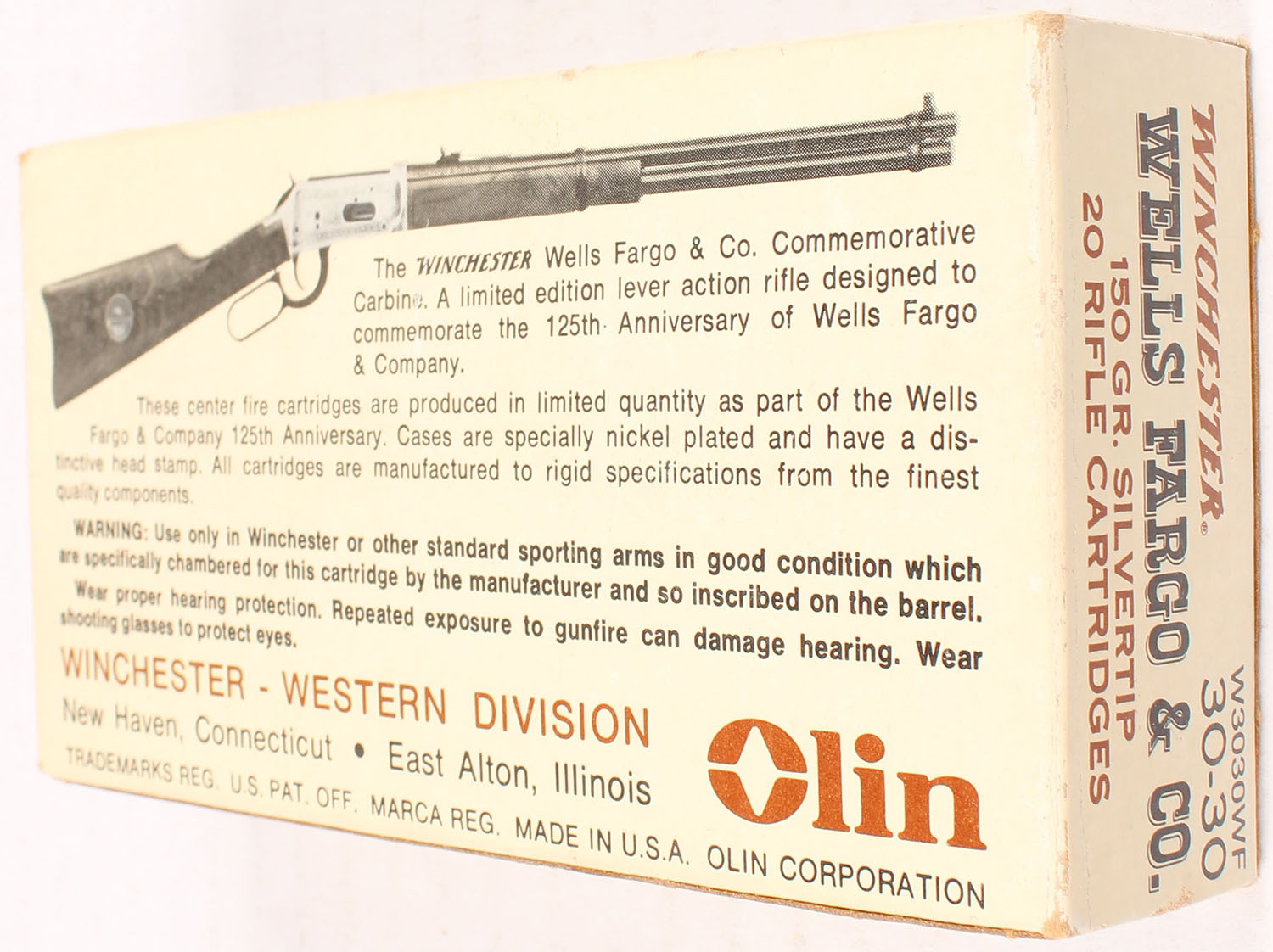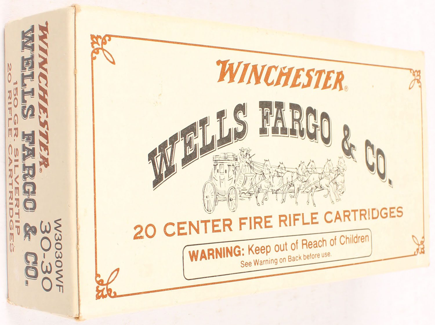 Winchester, Wells Fargo & Co., .30-30 Winchester, 150 Grain Silvertip, Full, 1pc. Brown box, box is solid with excellent color, very minor age soiling & corner wear, edges are crisp, end flaps are solid, ammo is minty. Grade: Excellent + - Value: 30 to 90