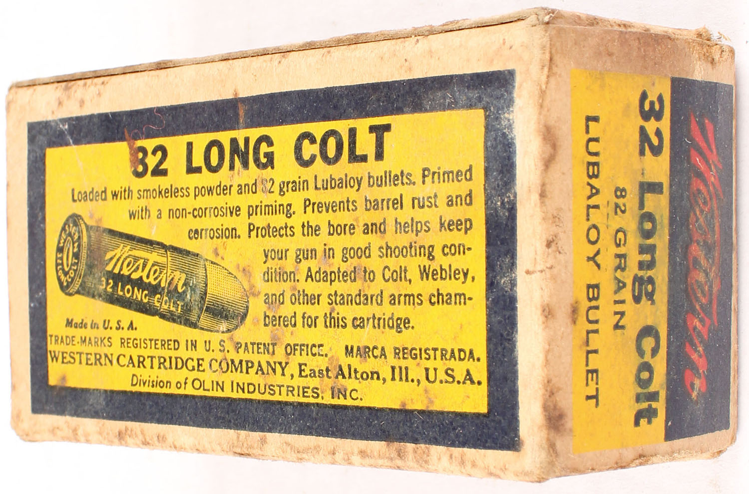 Western, Lubaloy, .32 Long Colt, 82 Grain Lubaloy Bullet, Full, 1pc. Blue yellow & red bulls eye box, box is solid with good color, age soiling, corner wear, some edge wear, staining throughout, top has been written on, end flaps are solid, ammo is excellent. Grade: Good + - Value: 20 to 80