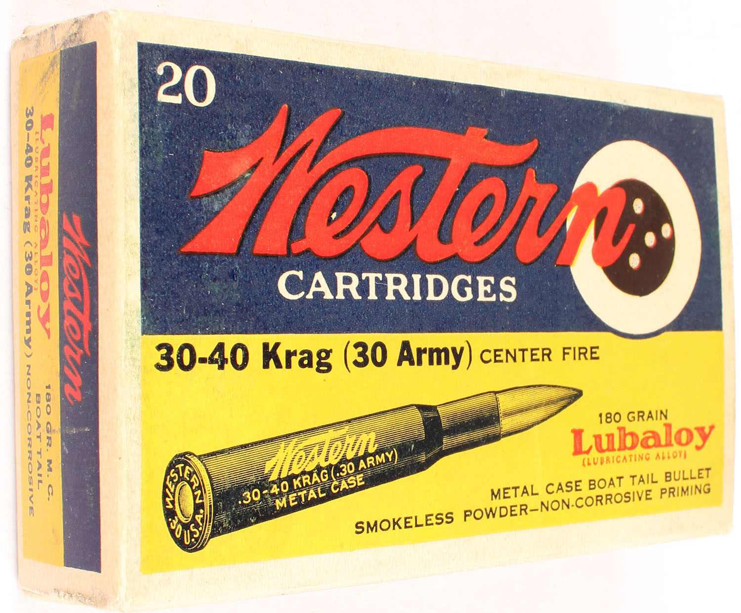 Western, Lubaloy, .30-40 Krag (.30 Army), 180 Grain Metal Case Boat Tail Bullet, Full, 1pc. Blue yellow & red bulls eye box, box is solid with excellent color, very minor age soiling & color bleeding, very minor corner wear, edges are crisp, end flaps are solid, ammo is excellent. Grade: Excellent - Value: 20 to 60