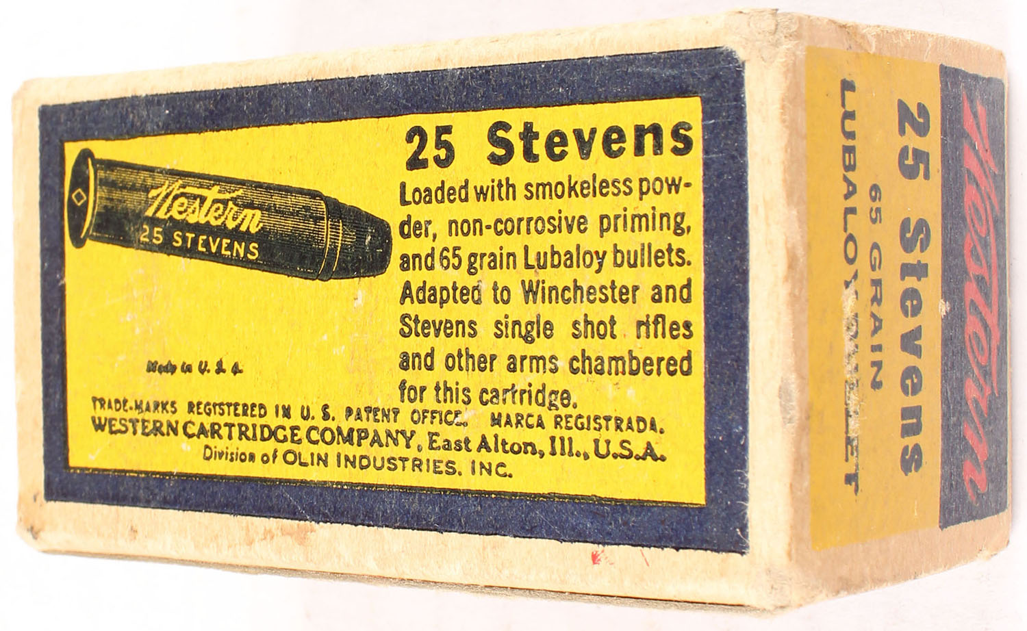 Western, Lubaloy, .25 Stevens Rim Fire, 65 Grain Lubaloy Bullet, Partial 48rds., 1pc. Blue yellow & red bulls eye box, box is solid with very good color, some age soiling, corner wear, minor edge wear, end flaps are solid, ammo is excellent. Grade: Very Good ++ - Value: 40 to 120