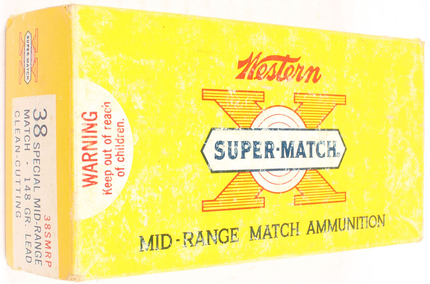 Western, Super-Match, .38 Special Mid-Range, 148 Grain Lead Clean-Cutting, Full of mixed H/S, 1pc. Yellow white & red box, box is solid with good to very good color, shelf wear, minor edge & corner wear, end flaps are solid, ammo is excellent. Grade: Very Good + - Value: 10 to 50