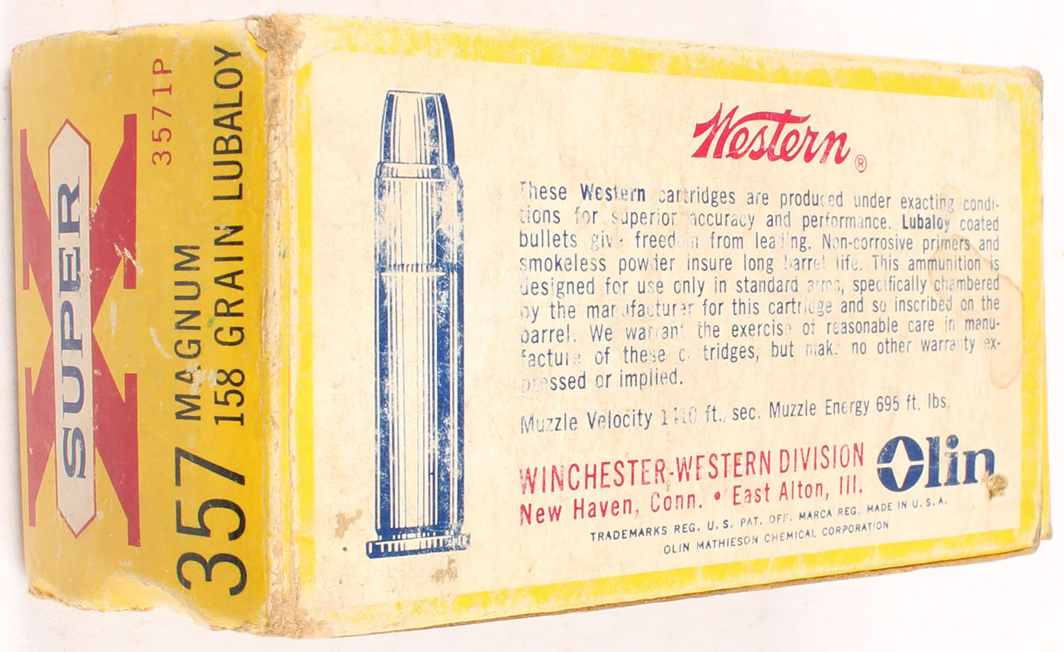 Western, Super X, .357 Magnum, 158 Grain Lubaloy, Full, 1pc. Yellow white & red box, box is solid with very good color, some shelf wear, edge & corner wear, end flaps are solid, top has been written on, ammo is excellent. Grade: Very Good - Value: 10 to 40