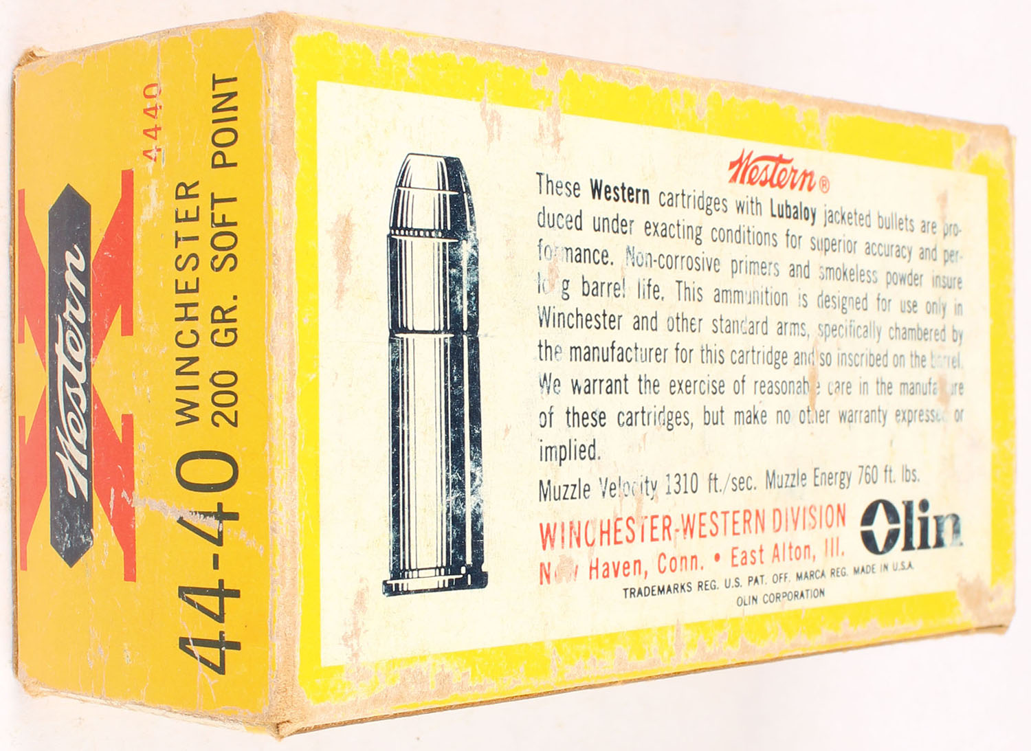 Western, X, .44-40 Winchester, 200 Grain Soft Point, Full, 1pc. Yellow white & red box, box is solid with very good color, shelf wear, minor age soiling, some edge & corner wear, end flaps are solid, ammo is excellent. Grade: Very Good + - Value: 100 to 300
