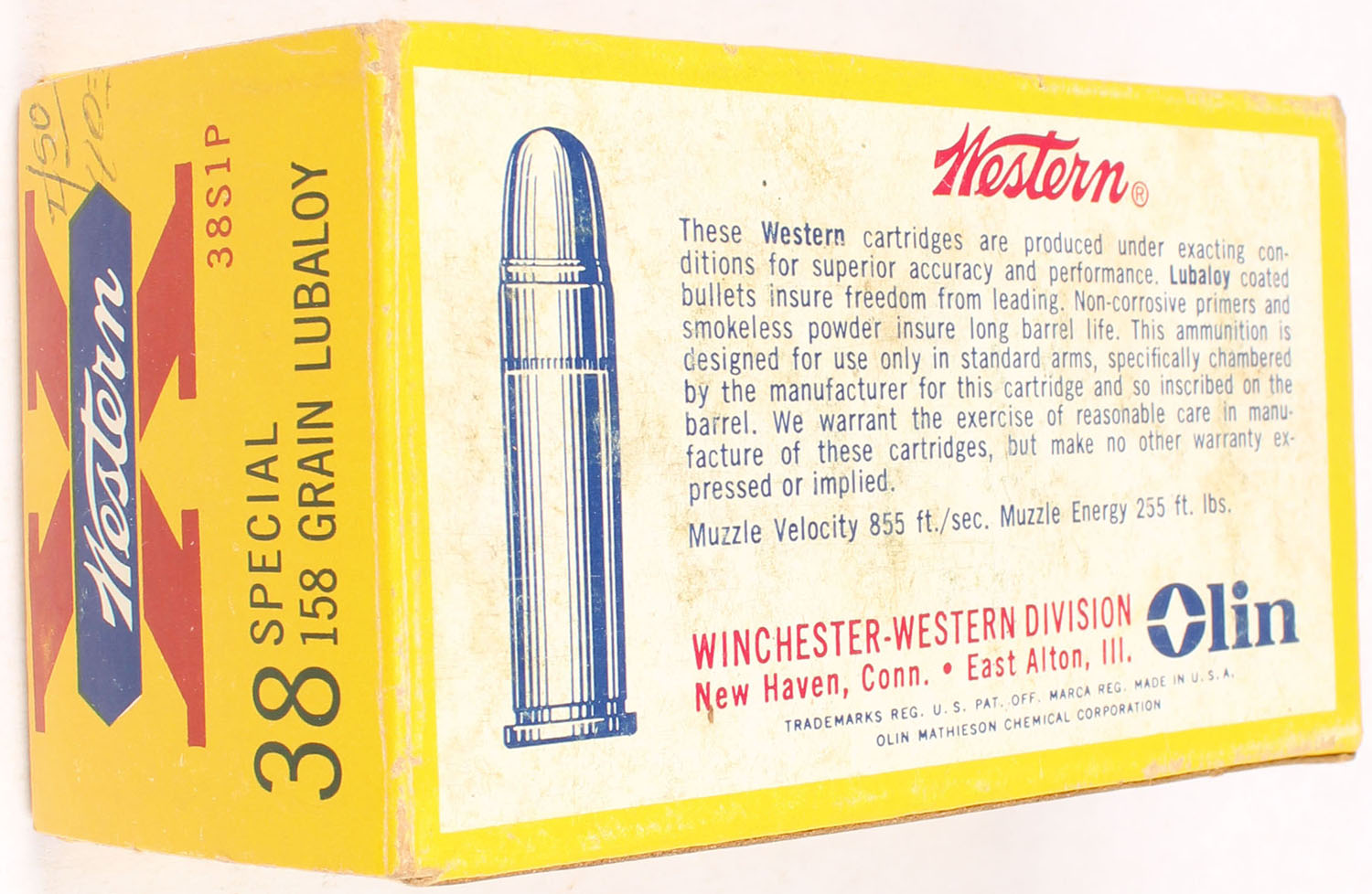 Western, X, .38 Special, 158 Grain Lubaloy, Full, 1pc. Yellow white & red box, box is solid with excellent color, very minor age soiling & corner wear, edges are crisp, end flaps are solid, ammo is excellent. Grade: Excellent + - Value: 20 to 60