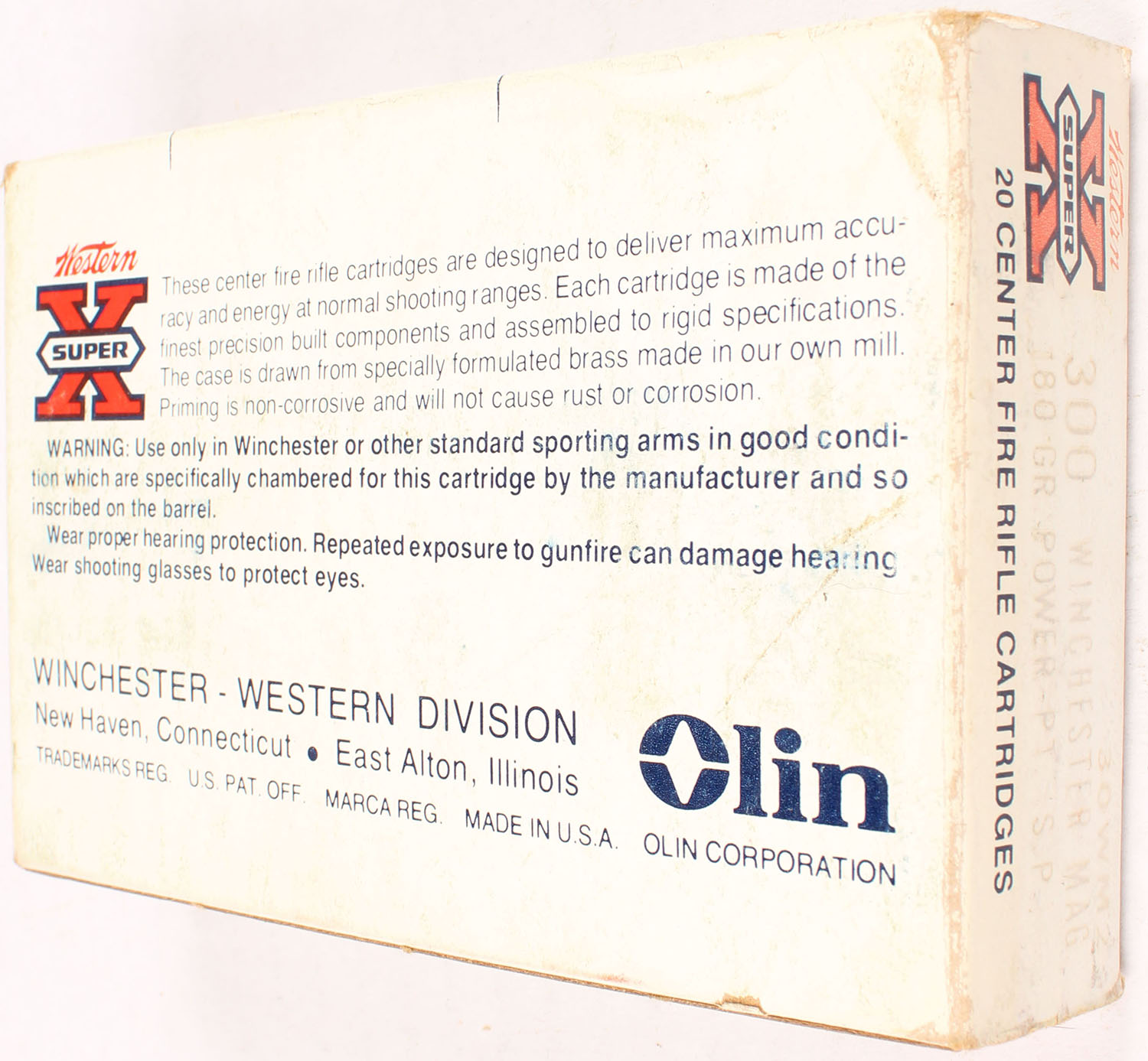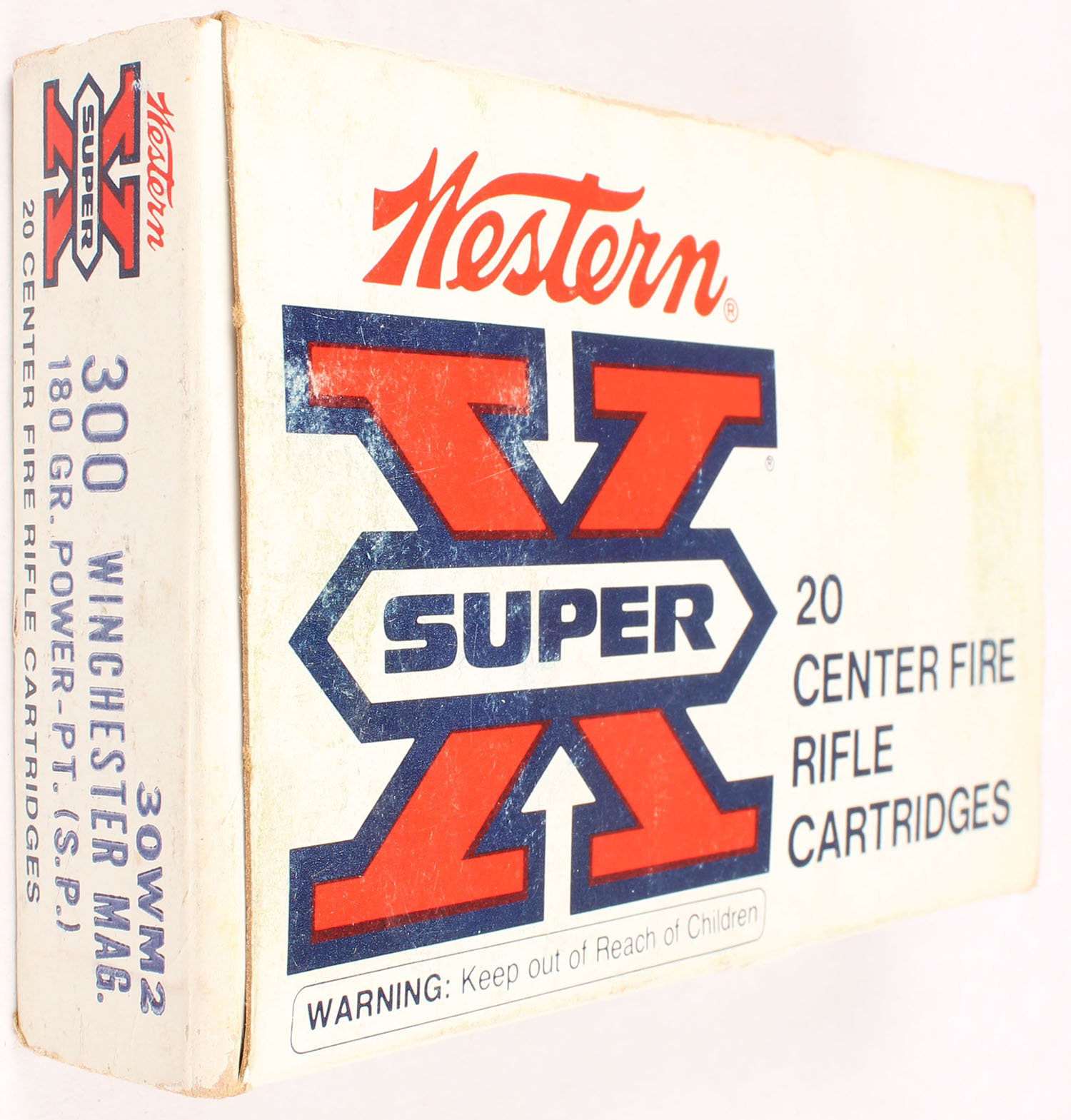 Western, Super X, .300 Winchester Magnum, 180 Grain Power-Point, Full, 1pc. White red & black box, box is solid with very good color, minor age soiling, some shelf wear, minor edge & corner wear, end flaps are solid, ammo is excellent. Grade: Very Good ++ - Value: 20 to 60