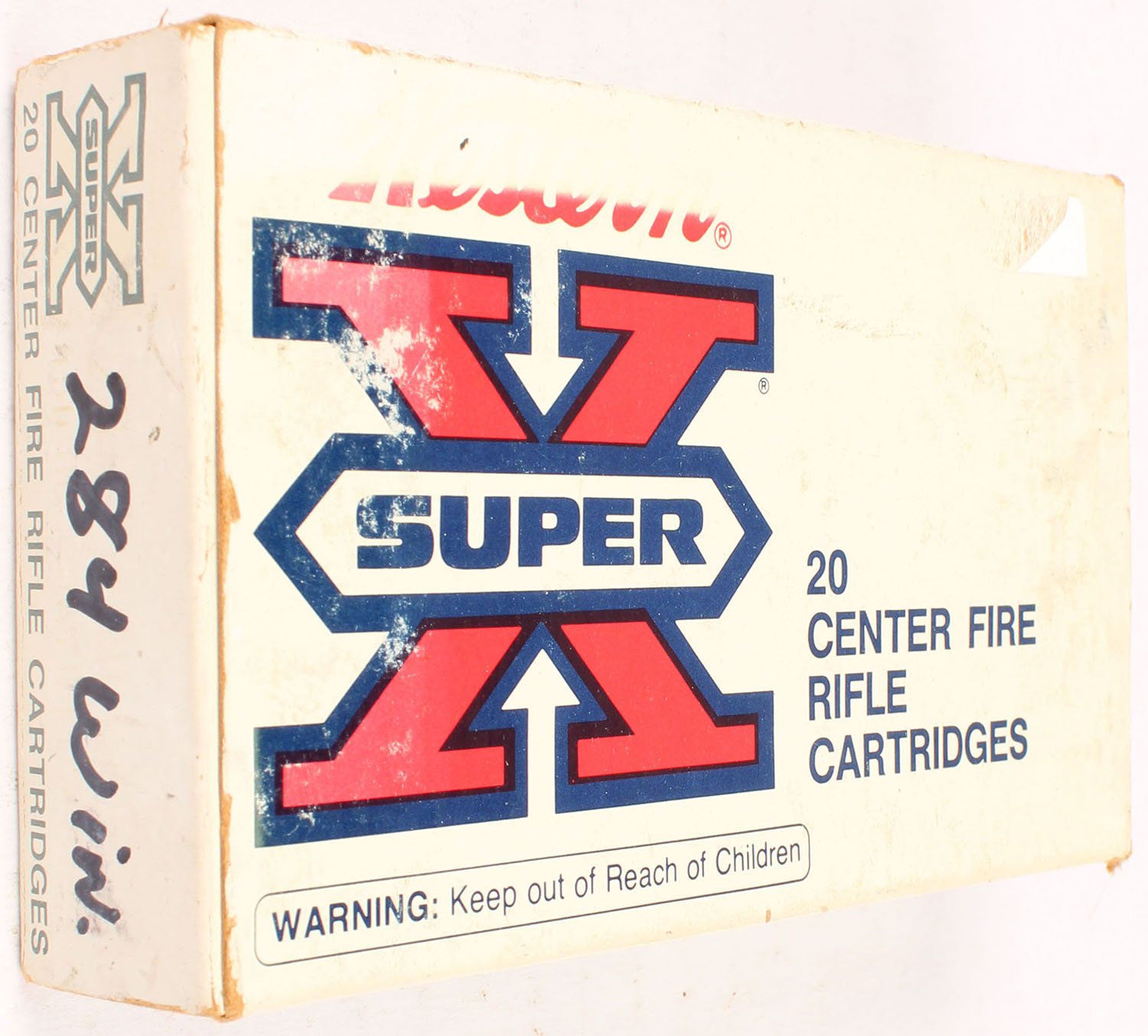 Western, Super X, .284 Winchester, 150 Grain Power-Point, Full, 1pc. White red & black box, box is solid with good color, age soiling, color fading, some shelf wear, minor corner wear, edges are mostly crisp, end flaps are solid, left end flap has been written on, ammo is excellent. Grade: Very Good - Value: 20 to 60