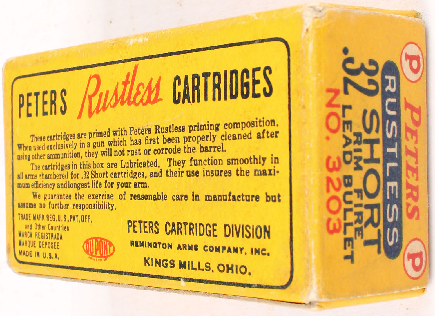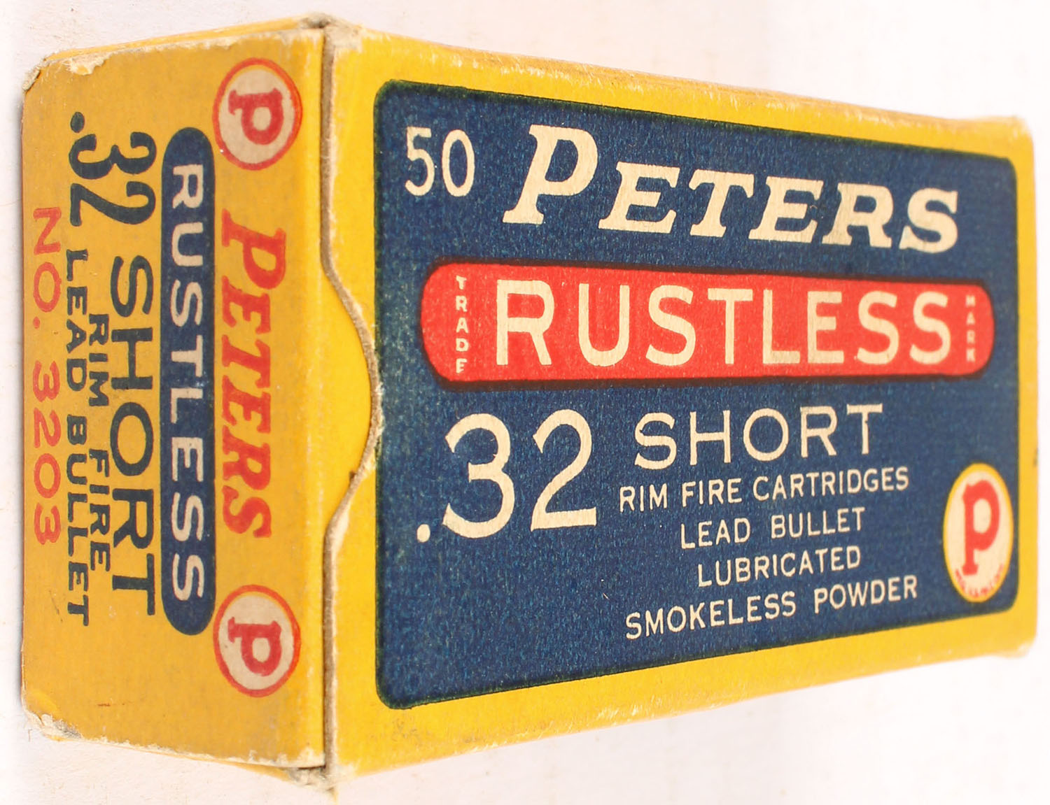 Peters, Rustless, .32 short, R.F., Lubricated lead bullet, 1pc, Full, yellow box with blue/red label & white/black print, box is solid with light rub marks, & light edge wear, ammo is excellent. Grade: Excellent + - Value: 50 to 150
