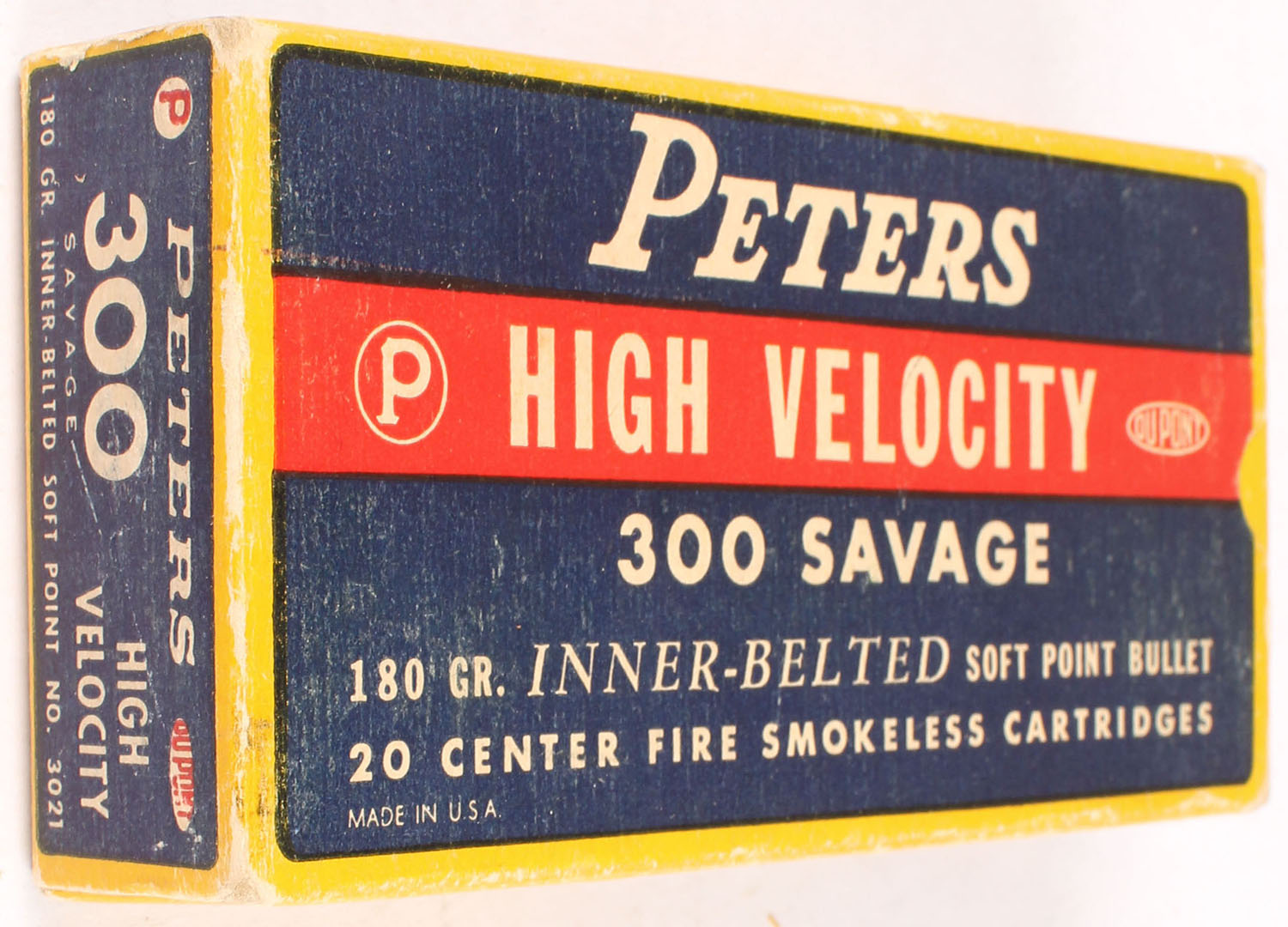 Peters, High Velocity, .300 Savage, 180 Grain Inner-Belted, Soft Point Bullet, Full, 1pc. Blue yellow & red box, box is solid with excellent color, very minor age soiling & shelf wear, minor corner wear, edges are mostly crisp, end flaps are solid, ammo is excellent. Grade: Excellent - Value: 30 to 90