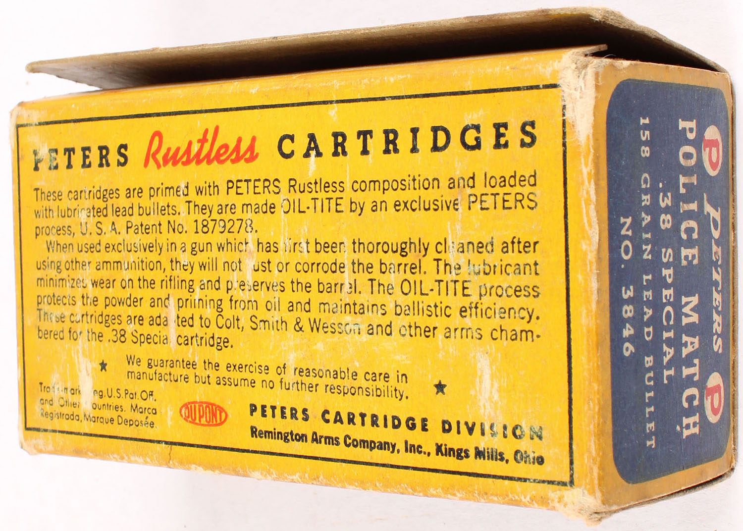 Peters, Police Match, .38 Special, 158 Grain Lead Bullet, Partial 48rds., 1pc. Blue & yellow box, factory seam has unadhered, very good color, age soiling, some shelf wear, some edge & corner wear, end flaps are solid, ammo is excellent. Grade: Very Good - Value: 20 to 60