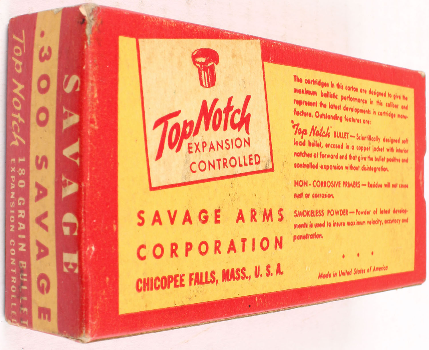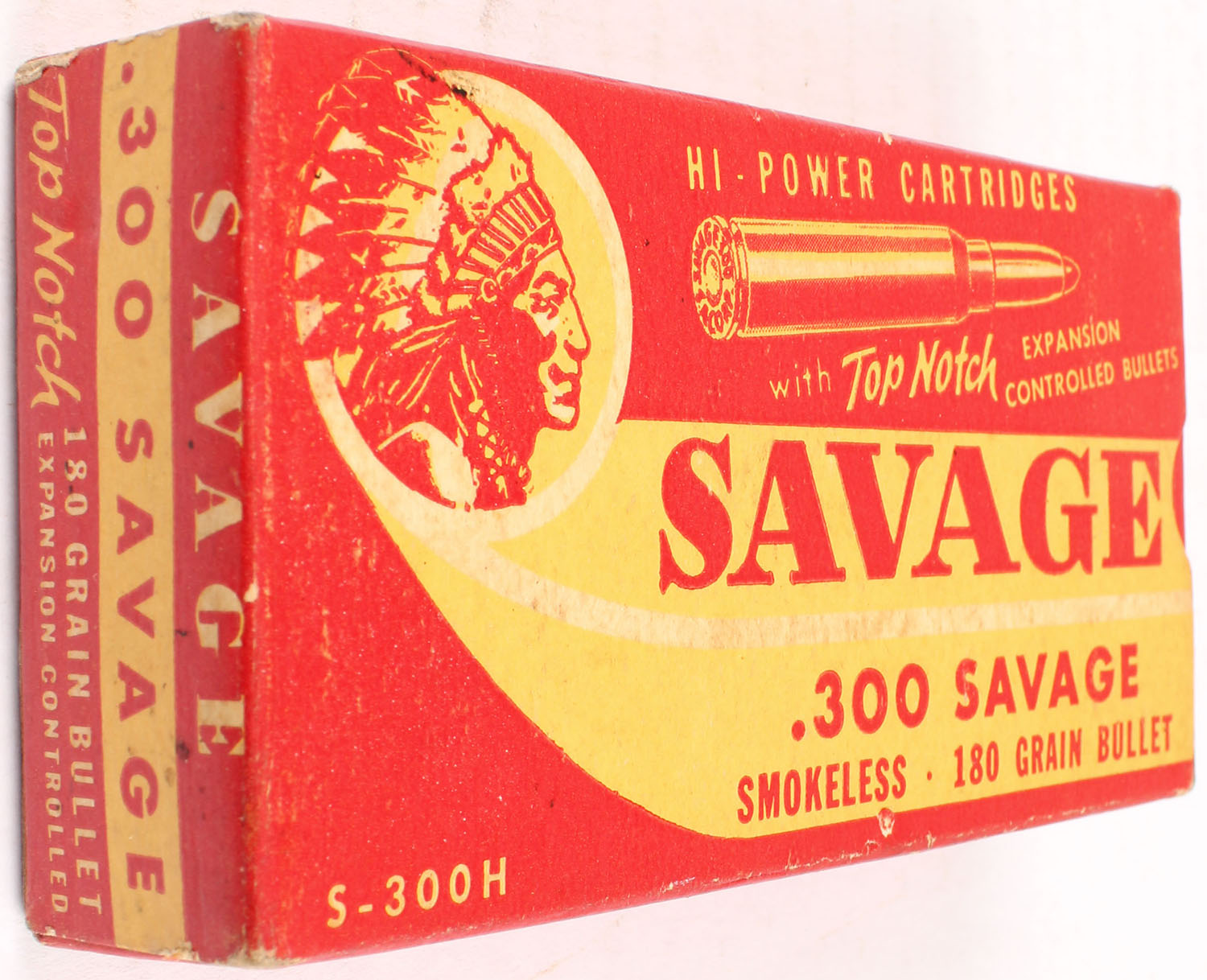 Savage, Hi-Power Cartridges, .300 Savage, 180 Grain Bullet, Full, 1pc. Red & yellow box, box is solid with excellent color, minor age soiling & corner wear, very minor edge wear, end flaps are solid, ammo is excellent. Grade: Excellent - Value: 40 to 120