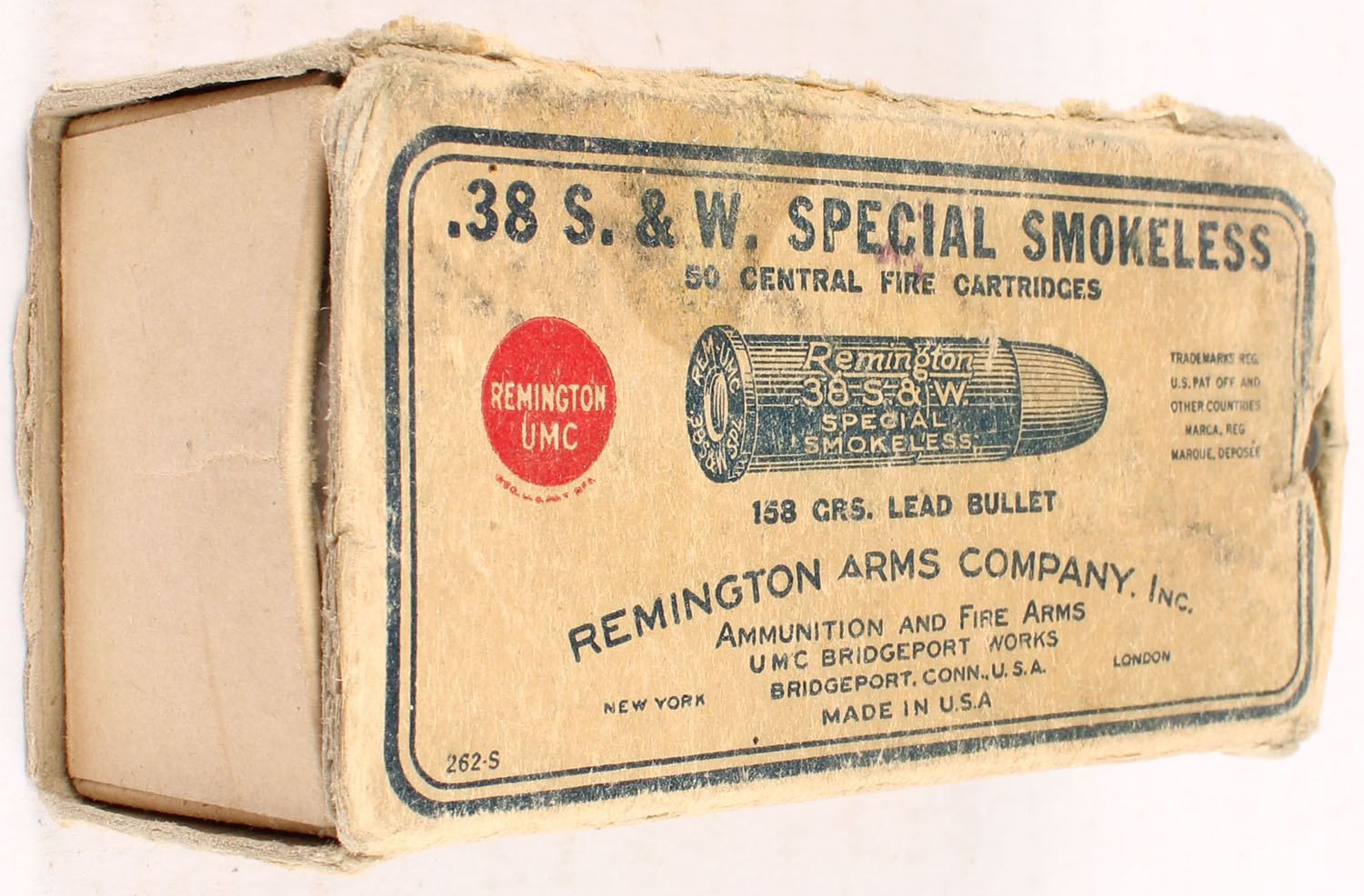 REM-UMC, .38 Special, 158 Grain Lead Bullet, Smokeless, Partial 44rds. Of incorrect ammo, 1pc. Buff box, box is missing both end flaps, very good color, some age soiling & shelf wear, staining on top, edge & corner wear, ammo is very good. Grade: Good + - Value: 8 to 40