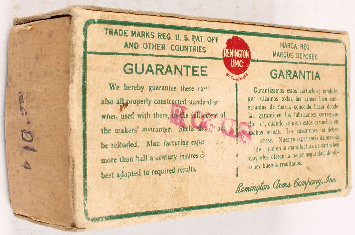 Remington, Kleanbore, .38 Super Automatic Colt, 130 Grain Metal Cased Bullet, Full, 1pc. Green buff & red dogbone box, missing both end flaps, tear on right end, very good color, some age soiling, corner wear, minor edge wear, ammo is excellent. Grade: Good ++ - Value: 10 to 40