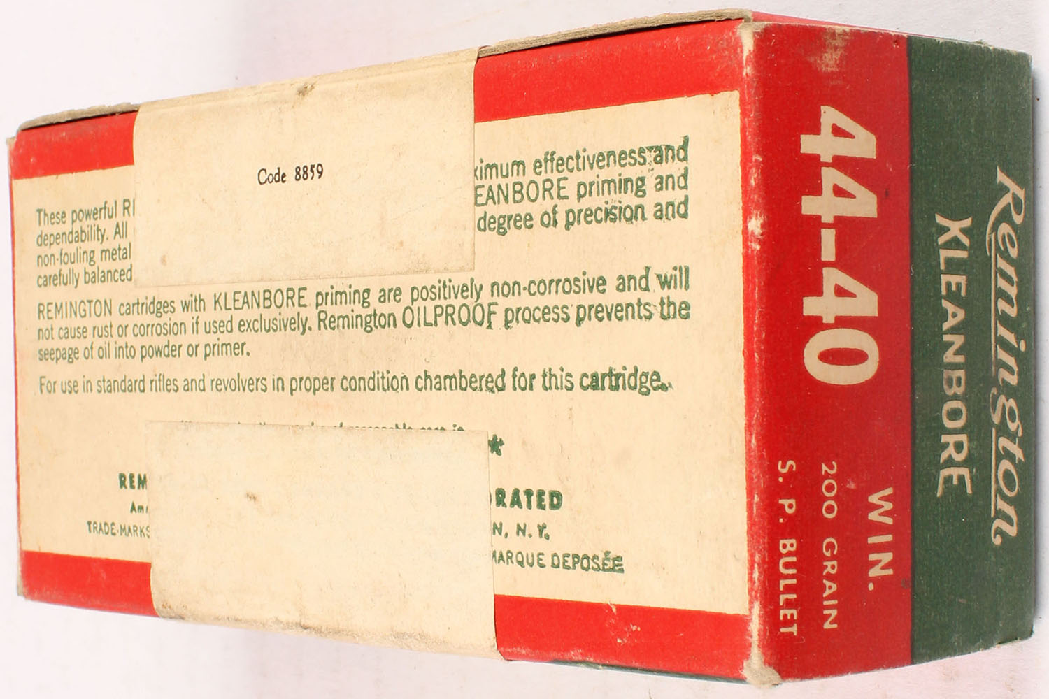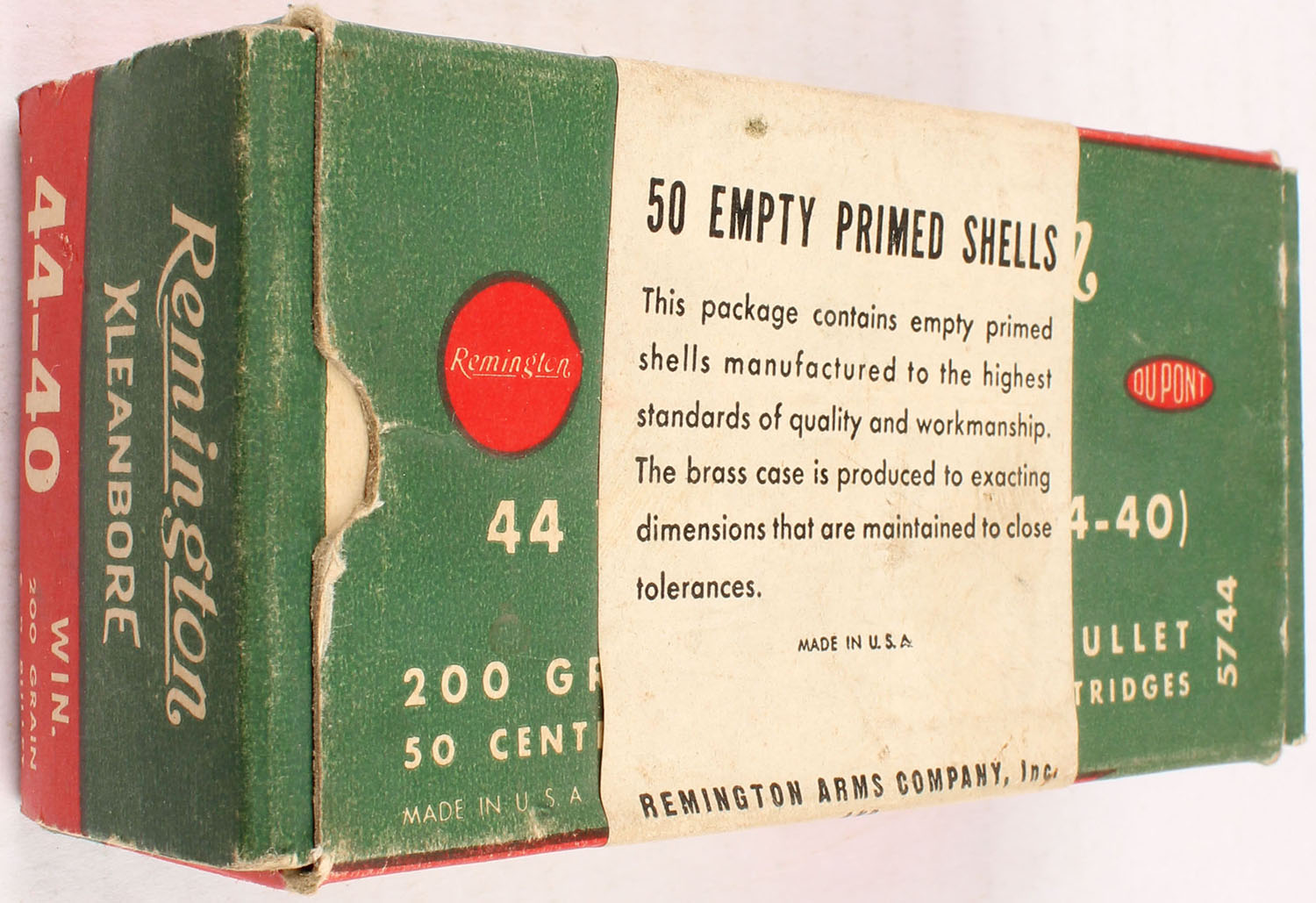 Remington, Kleanbore, .44 Winchester (.44-40), Empty Primed Shells, Partial 38rds., 1pc. Green red & white box with white over-label, box is solid with very good to excellent color, some age soiling, minor corner wear, edges are mostly crisp, end flaps are solid, shells are excellent. Grade: Excellent - Value: 6 to 60